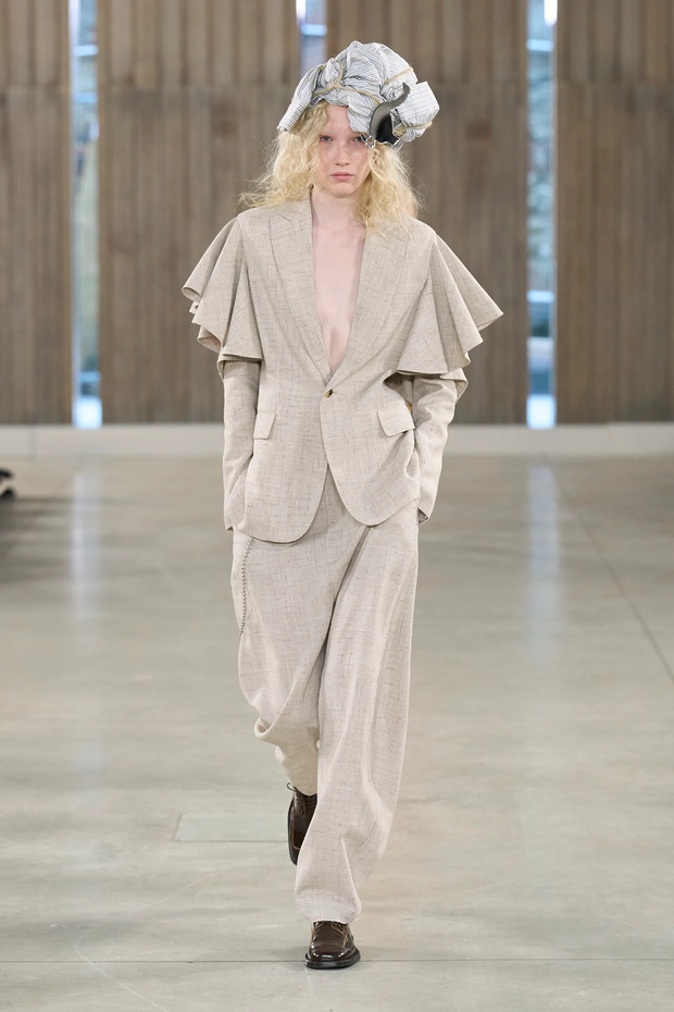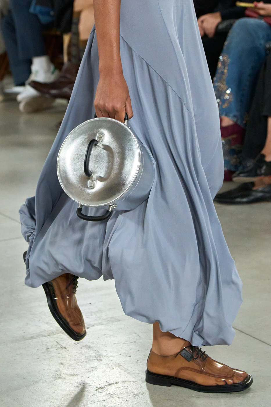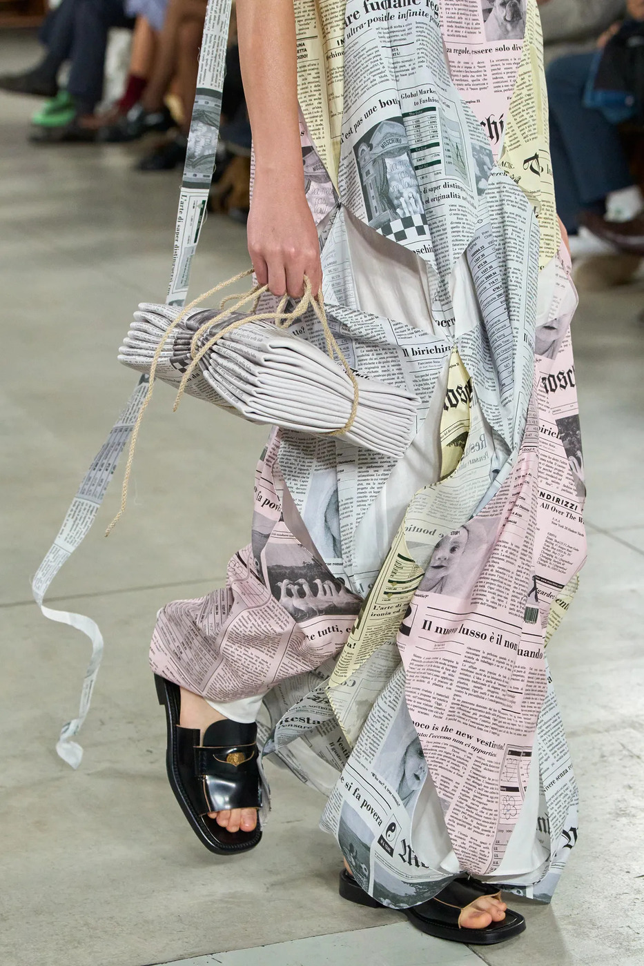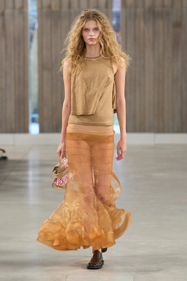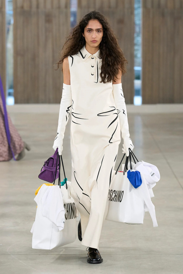 모스키노는 재치로 무대를 채웠습니다. 일상 속 흔한 물건을 귀한 오브제로 탈바꿈했죠. 화장실 브러시 모양 샌들, 택배 박스 가방, 티셔츠를 이어 붙인 드레스, 심지어 냄비까지 등장했습니다. 아드리안 아피올라자는 1960년대 말 이탈리아 미술 운동 ‘아르테 포베라(Arte Povera)’를 영감 삼아, 평범한 사물을 유머러스하게 비틀었습니다. “귀함이라는 개념을 ‘궁핍한 곳’에서 가져오고 싶었어요.”