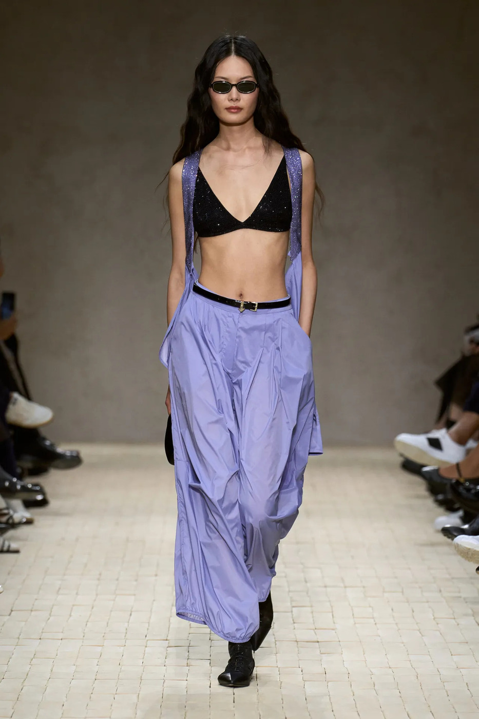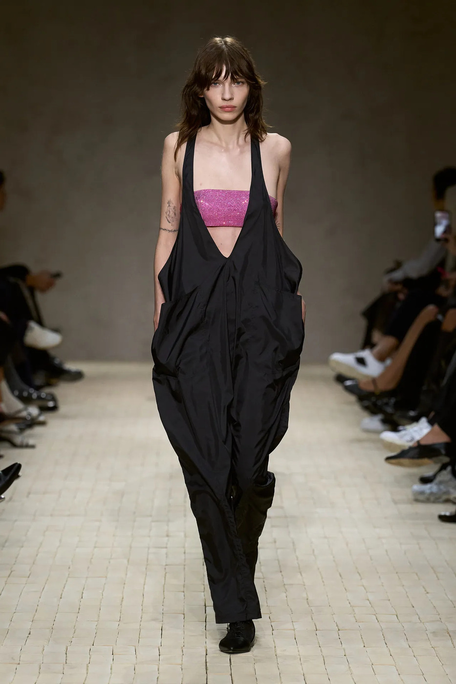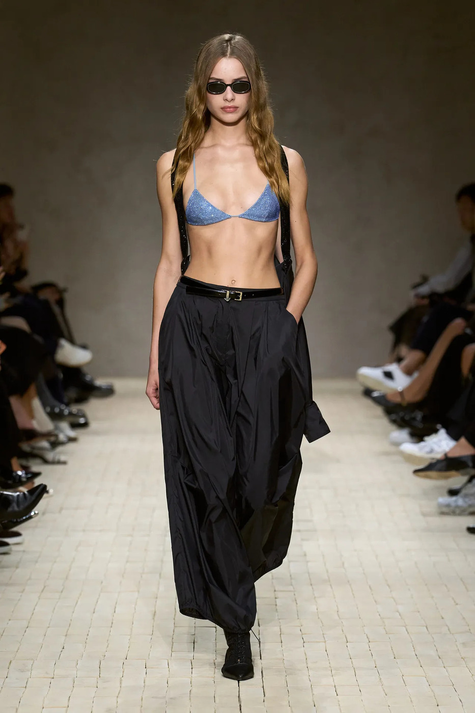 이후 군복과 오페라 글러브, 프레피 폴로와 버블 스커트 같은 의외의 조합이 전개됐습니다. 그 속에서도 과감한 컬러 배치와 동시대 여성의 실루엣을 조명하는 프라다의 무드는 여전히 유지했고요. ‘프라다-이즘(Prada-ism)’이라는 현상을 실감한 순간이었습니다. 인상 깊었던 건 가슴을 지탱하는 밑 밴드를 빼고 모양만 낸 브라 톱, 몸에서 떠 있는 서스펜더 스커트, 깊이 파여 훌렁 벗겨질 듯한 브이넥 니트 같은 옷들이었습니다. 옷의 핏이 비틀려 있다기보다 아예 핏을 만들지 않은 쪽에 가까웠죠. 마치 옷들이 몸을 떠나 자유를 찾아가는 듯한 모습이었습니다. 군복의 엄격함과 이 자유로운 흐름이 극과 극으로 치닫는 가운데에서도 프라다는 중심을 잃지 않았습니다.