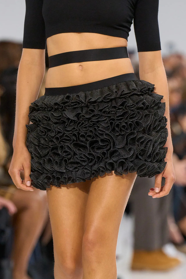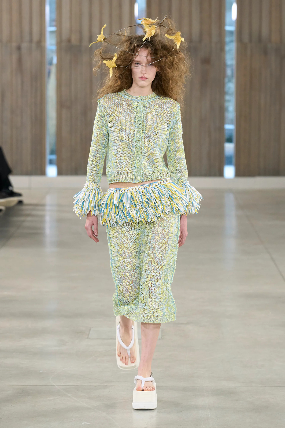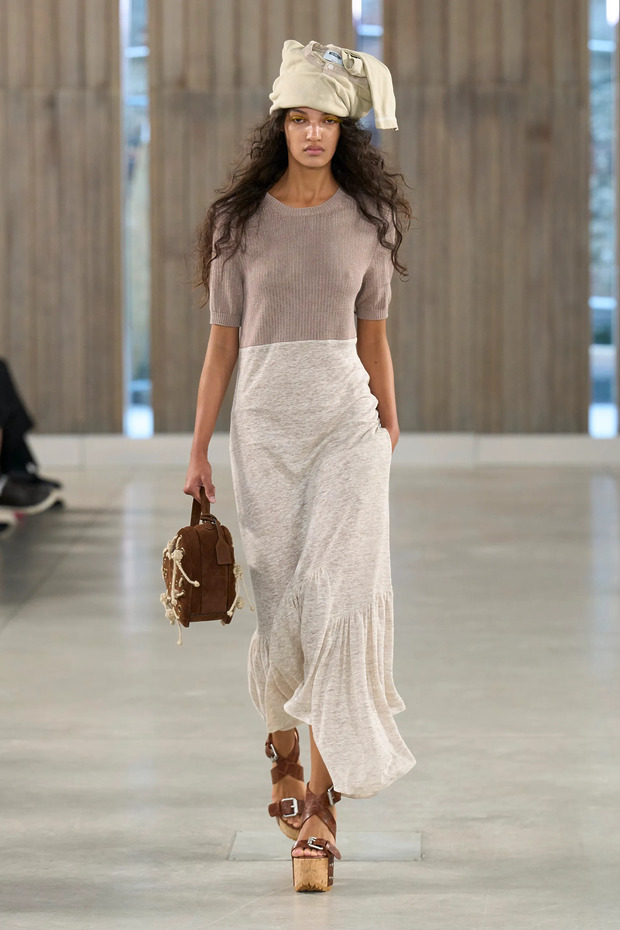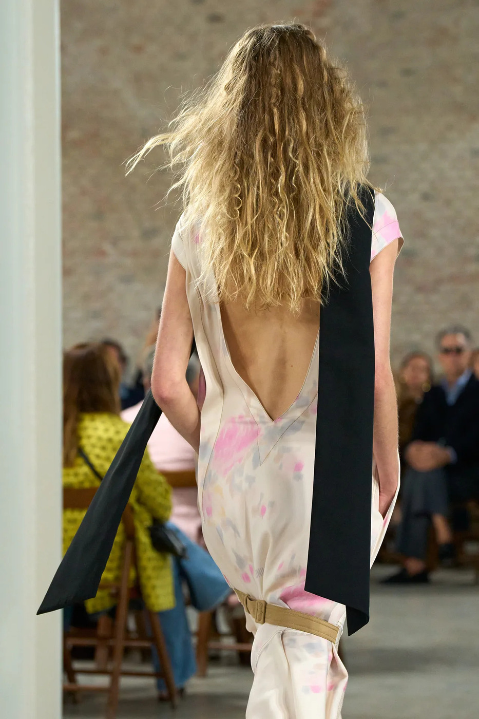 이후 군복과 오페라 글러브, 프레피 폴로와 버블 스커트 같은 의외의 조합이 전개됐습니다. 그 속에서도 과감한 컬러 배치와 동시대 여성의 실루엣을 조명하는 프라다의 무드는 여전히 유지했고요. ‘프라다-이즘(Prada-ism)’이라는 현상을 실감한 순간이었습니다. 인상 깊었던 건 가슴을 지탱하는 밑 밴드를 빼고 모양만 낸 브라 톱, 몸에서 떠 있는 서스펜더 스커트, 깊이 파여 훌렁 벗겨질 듯한 브이넥 니트 같은 옷들이었습니다. 옷의 핏이 비틀려 있다기보다 아예 핏을 만들지 않은 쪽에 가까웠죠. 마치 옷들이 몸을 떠나 자유를 찾아가는 듯한 모습이었습니다. 군복의 엄격함과 이 자유로운 흐름이 극과 극으로 치닫는 가운데에서도 프라다는 중심을 잃지 않았습니다.