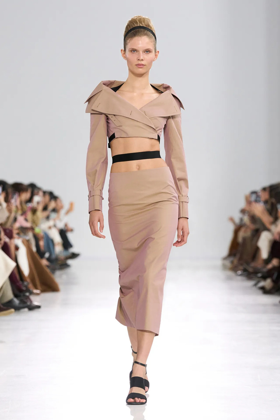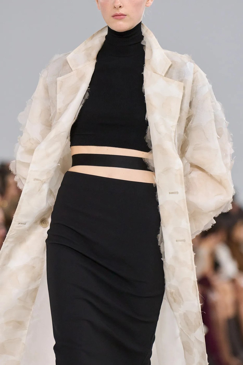 막스마라의 본질은 언제나처럼 테일러링과 코트였습니다. 날카롭게 재단한 수트가 줄을 지었죠. 트렌치 코트는 스위트하트 네크라인으로 확장하거나 크롭트 톱과 펜슬 스커트로 분해했습니다. 허리에는 검정 벨트를 둘러 절제했고요. 막스마라는 혁신보다 신뢰를 택했습니다. 브랜드의 입지를 고려한 신중한 선택이었죠.