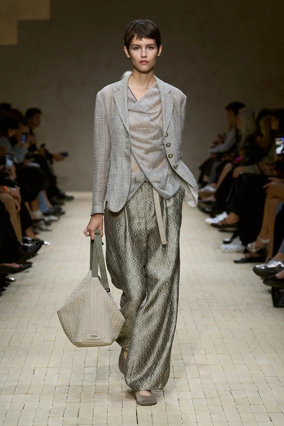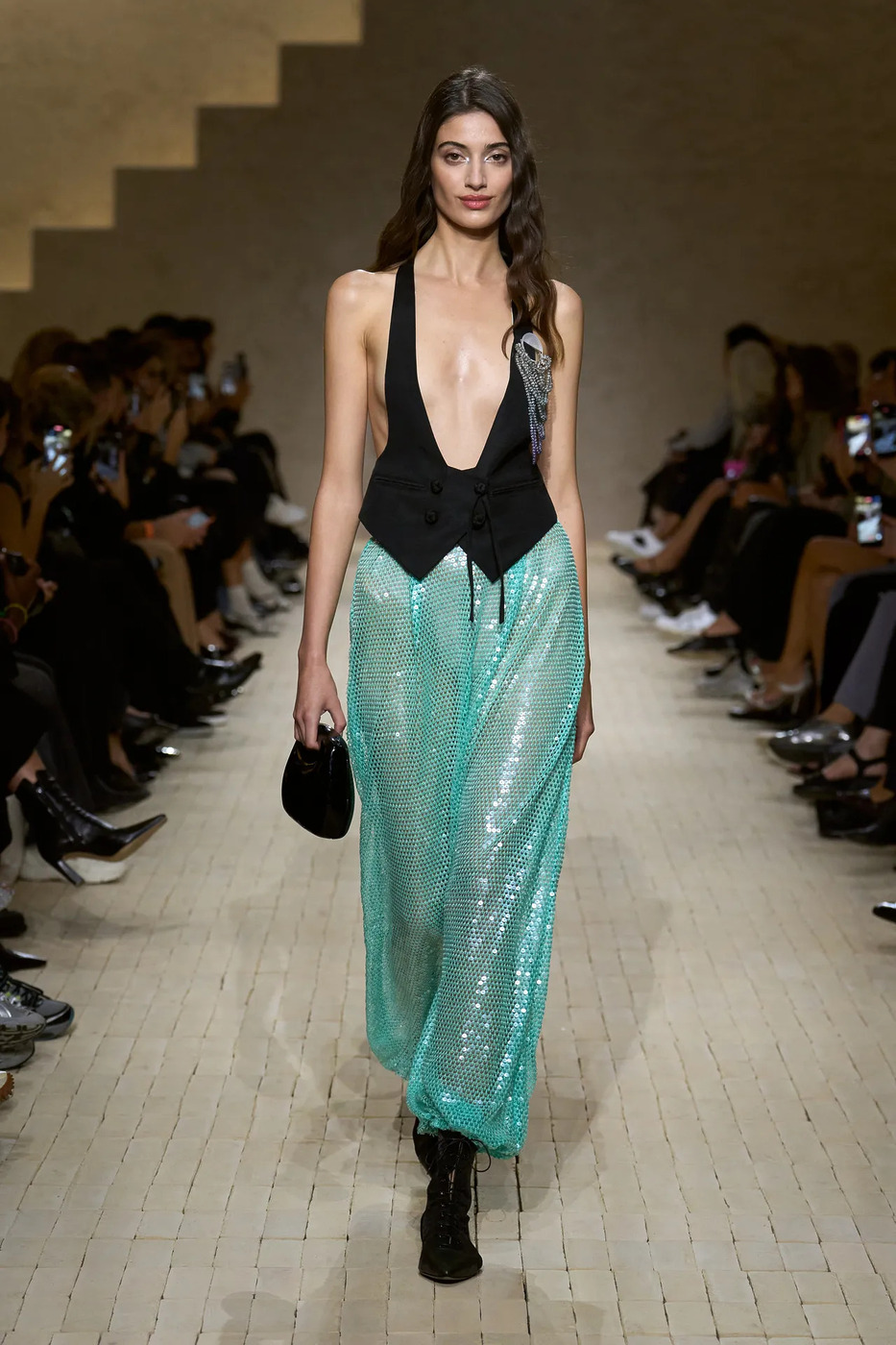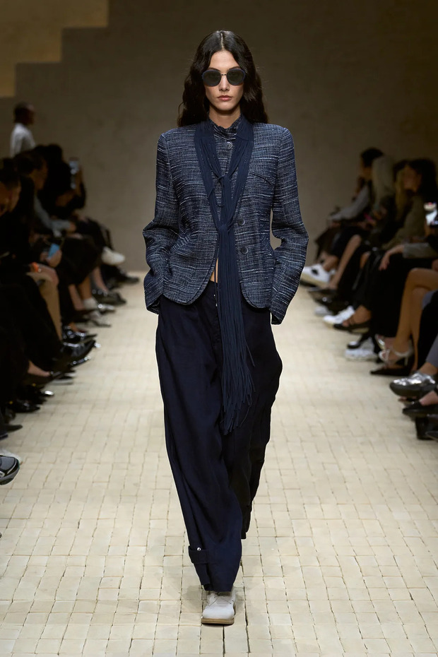 이번 컬렉션은 애초에 창립 50주년 기념 쇼로 기획되었으나, 조르지오 아르마니가 타계한 후 추모 무대로 바뀌었습니다. 무대는 무거운 동시에 허전했습니다. ‘여행에서 막 돌아온 순간의 몽환적 감각’이라는 테마와 아직 실감 나지 않는 그의 부재가 겹쳤죠. 뉴트럴한 색감의 루스한 면으로 시작된 컬렉션은 메탈릭한 실크, 이캇(Ikat) 프린트, 허리선을 잡은 벨트로 이어지며 점차 힘을 쌓아갔습니다. 후반부로 갈수록 시퀸이 더해져 클라이맥스를 향했고, 마지막은 핫핑크와 보라, 바닷빛 시폰으로 만든 홀터 드레스와 브라 톱, 하렘 팬츠가 런웨이를 물들이며 폭발적인 피날레를 완성했습니다. 관객이 오랜 시간 보낸 기립박수는 단순히 무대를 향한 환호가 아니었습니다. 컬렉션 곳곳에 스며든 특유의 코드를 구축해온 아르마니에게 사랑과 존경을 표하는 것이었죠.