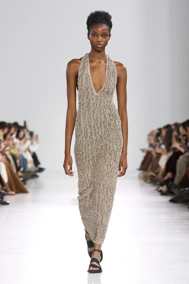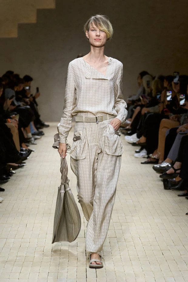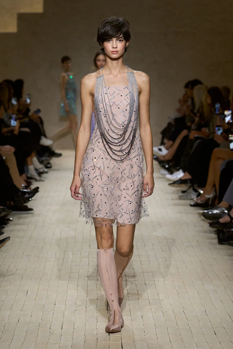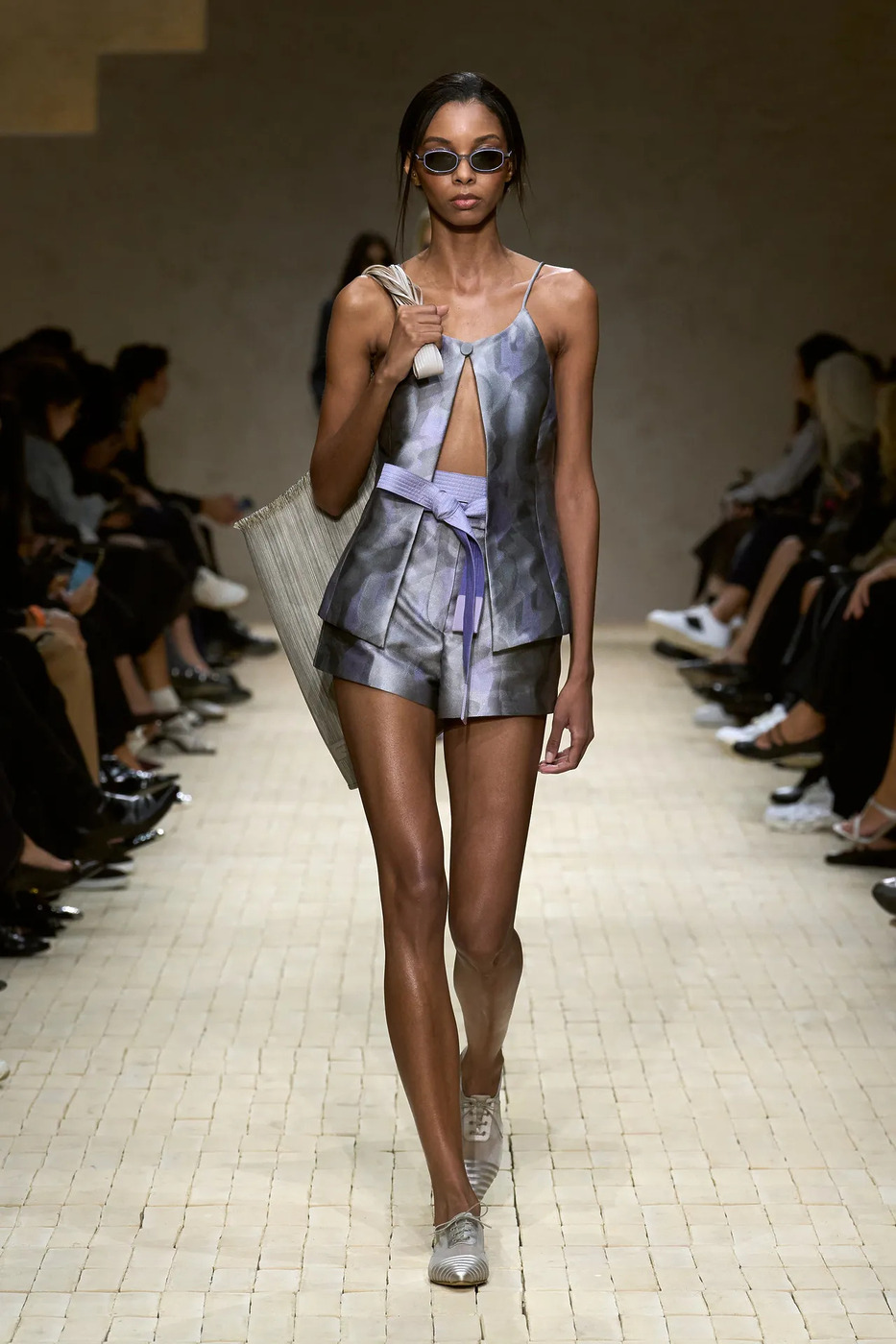 이번 컬렉션은 애초에 창립 50주년 기념 쇼로 기획되었으나, 조르지오 아르마니가 타계한 후 추모 무대로 바뀌었습니다. 무대는 무거운 동시에 허전했습니다. ‘여행에서 막 돌아온 순간의 몽환적 감각’이라는 테마와 아직 실감 나지 않는 그의 부재가 겹쳤죠. 뉴트럴한 색감의 루스한 면으로 시작된 컬렉션은 메탈릭한 실크, 이캇(Ikat) 프린트, 허리선을 잡은 벨트로 이어지며 점차 힘을 쌓아갔습니다. 후반부로 갈수록 시퀸이 더해져 클라이맥스를 향했고, 마지막은 핫핑크와 보라, 바닷빛 시폰으로 만든 홀터 드레스와 브라 톱, 하렘 팬츠가 런웨이를 물들이며 폭발적인 피날레를 완성했습니다. 관객이 오랜 시간 보낸 기립박수는 단순히 무대를 향한 환호가 아니었습니다. 컬렉션 곳곳에 스며든 특유의 코드를 구축해온 아르마니에게 사랑과 존경을 표하는 것이었죠.