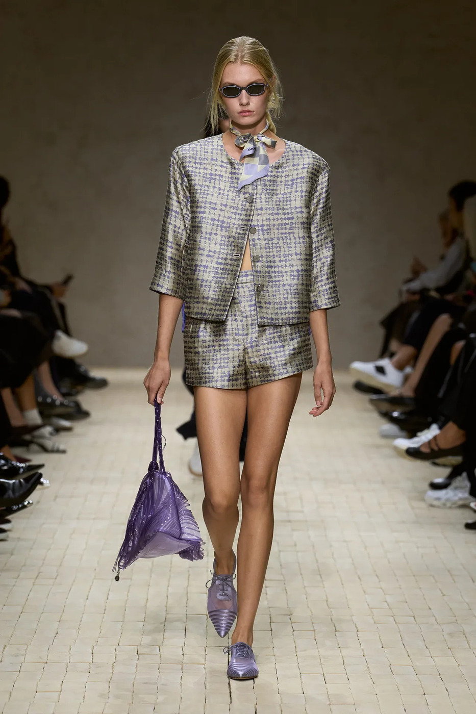 프라다는 첫 번째 룩부터 이번 컬렉션의 코드를 확실히 보여주었습니다. 자유와 불안을 거쳐, 다시 질서를 찾게 되는 순환을요. 군복 셋업, 각진 토트백과 로퍼 차림에 굳은 표정으로 등장한 모델은 절제된 단호함을 상징했습니다. 하지만 긴장한 턱 아래로 크리스털 드롭 이어링이 명랑하게 흔들리고, 젤을 발라 쓸어 넘긴 앞머리와 달리 목뒤로는 머리카락이 반항적으로 삐져나왔습니다. 그 불협화음에서 이번 컬렉션의 테마가 스며 나왔죠.