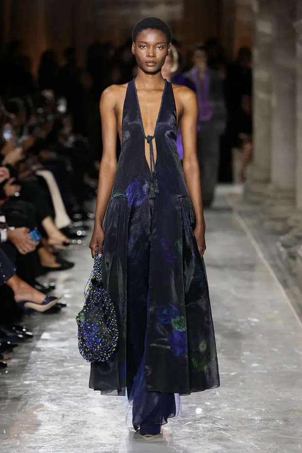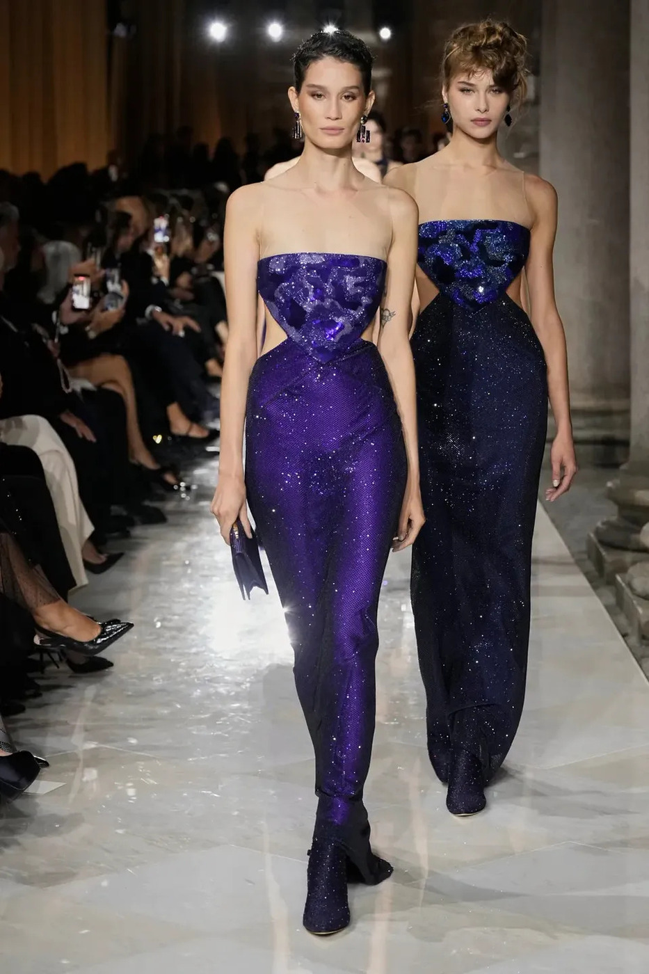 컬렉션은 섬의 유려함과 도시의 엄격함을 교차하며 전개됐습니다. 소재는 피부 위로 매끄럽게 흘렀고, 드레스와 수트는 길고 또렷한 라인을 그렸습니다. 여기에 밀라노 특유의 그레이지(Greige, Grey+Beige) 색조와 정교한 테일러링이 어우러지며, 바다의 유동성과 도시의 단단함이 교차하는 풍경을 만들었습니다. 낮에서 밤으로 이어지는 빛의 변화처럼, 바다의 청록부터 동양의 뉘앙스가 깃든 보라색까지 이어지며 잊을 수 없는 스펙트럼을 펼쳤습니다.
