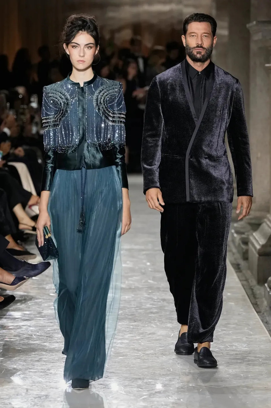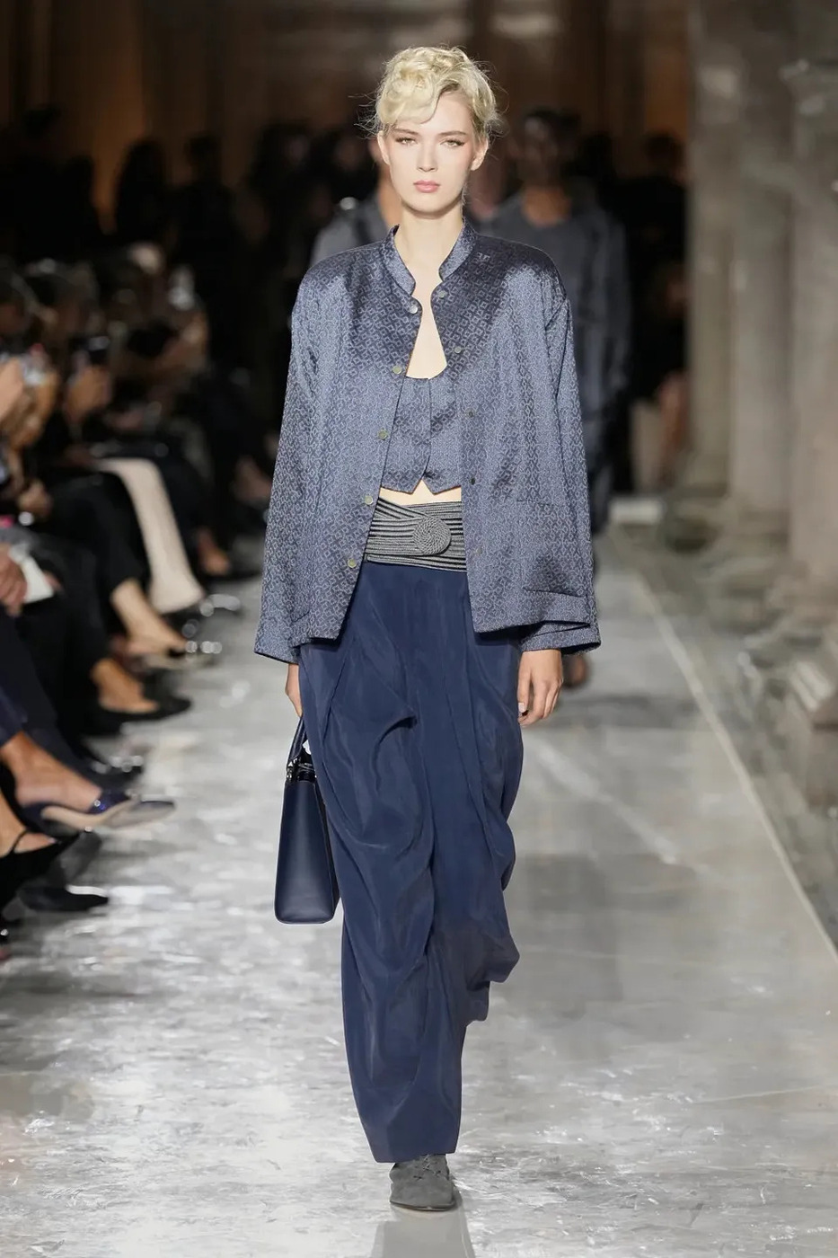 “가볍지만 강렬한 제스처, 무게감 없는 옷에서 태어나는 잊히지 않는 우아함.” 아르마니 특유의 역설적인 시그니처도 선명했습니다. 해체적이면서도 절제된 실루엣, 남성성과 여성성이 엇갈리며 만들어낸 크레셴도는 실용성과 자유로움이 공존하는 무대를 완성했습니다.