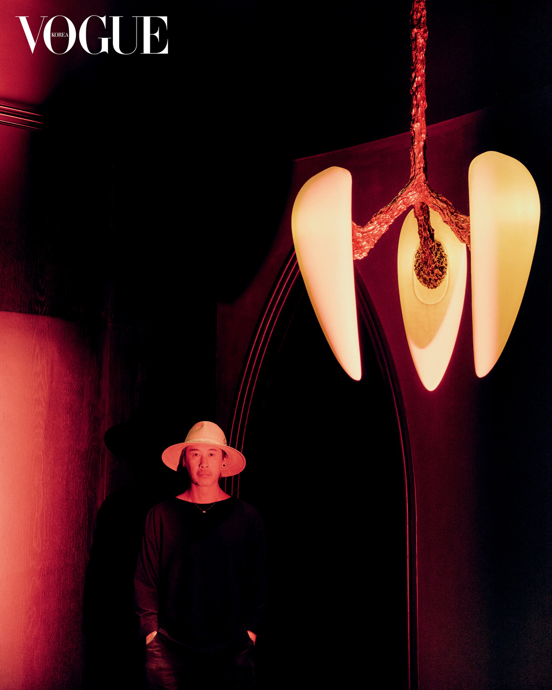 76㎡ 규모에 검정 일색인 매장에서 가장 눈에 띄는 건 프랑스 작가 윌리엄 기용(William Guillon)의 ‘LV-426’ 샹들리에. 상상 속 외계 생명체를 형상화해 영화 <에이리언> 시리즈에 등장하는 행성의 이름을 딴 이 청동 조명은 그의 작업실에도 있다. 다카하시는 그 아래 서서 <보그> 촬영을 진행했다. 돌돌 말아 올린 티셔츠 소매 끝으로 양팔에 있는 타투가 조금씩 드러났고, 밑단을 접은 바지 아래로는 닥터마틴과 협업한 체크무늬 밤색 로퍼를 신고 있었다. 유일한 액세서리인 이블아이 펜던트 목걸이와 밀짚모자 역시 각각 미국 주얼리 브랜드 시 리얼 플라워(See Real Flowers), 모자 브랜드 키지마 타카유키(Kijima Takayuki)와 함께한 언더커버 제품이다. 인터뷰를 하는 동안에는 둥근 뿔테 안경을 주기적으로 썼다 벗었고, 사진을 찍는 동안에는 선글라스를 쓰기도 했다.