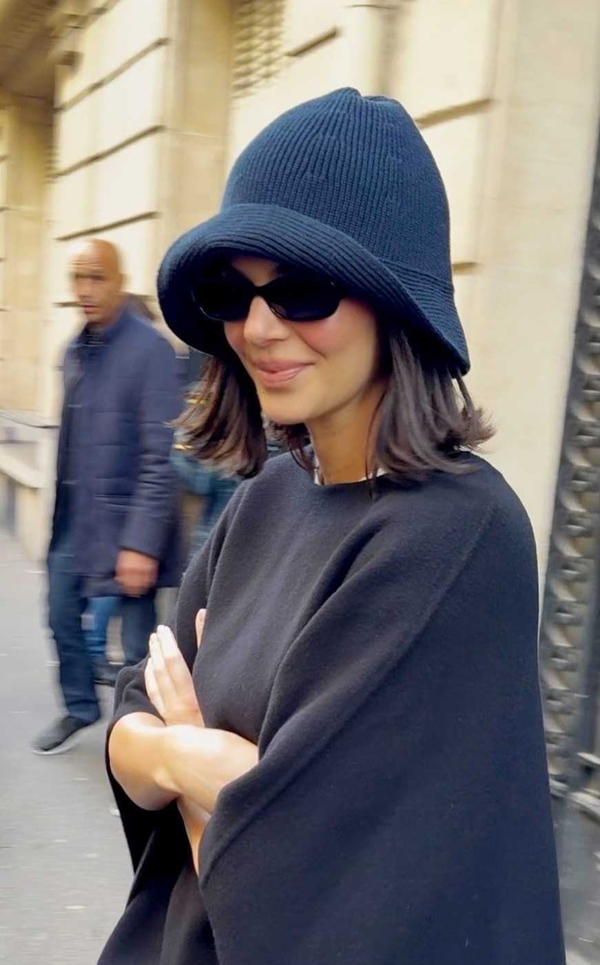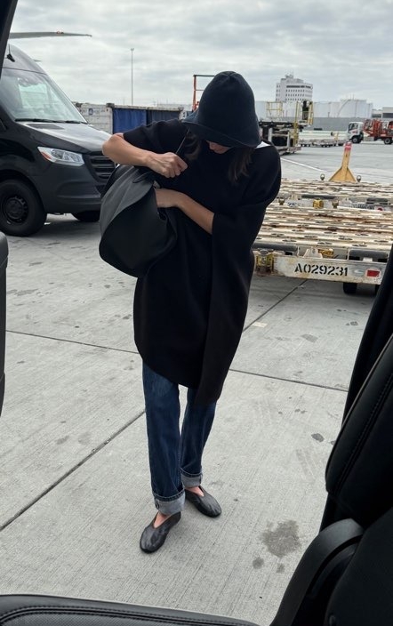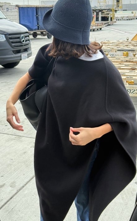 켄달은 가오리 핏에 가까운 케이프 스타일 코트를 입고 있었습니다. 2년 전에도 피비 파일로의 스카프 코트와 더 로우의 케이프 코트를 입은 모습과 유사한 분위기였죠. 생지 데님 느낌의 스트레이트 청바지를 롤업해 입은 뒤 흰색 티셔츠를 착용하고 그 위로 블랙 코트를 둘러주었죠. 영상으로 보니 암홀이 넓게 나와 있어 스웨터처럼 입지 않았을까 하는 생각이 들더군요. 여기에 슈즈와 백, 귀여운 모자까지 모두 심플한 더 로우 제품으로 매치했고요.