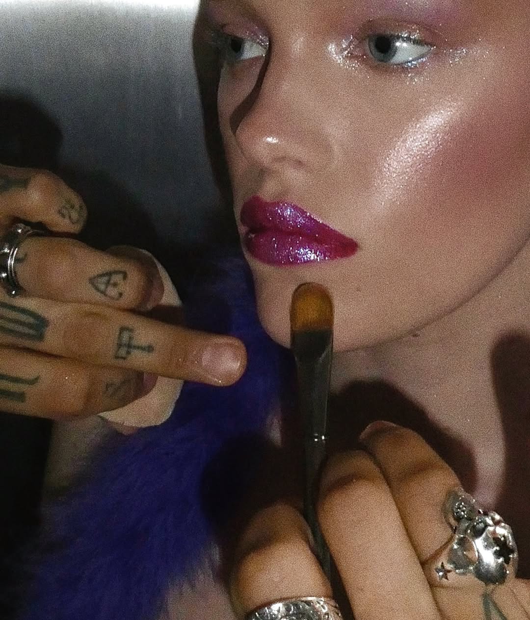 가장 쉽게 시도할 수 있는 방법은 립입니다. 립밤이나 립스틱 위에 글리터를 얹고 투명 글로스로 마무리하면 끝. 매트하게 마무리하면 사이버틱한 분위기, 촉촉하게 마무리하면 여리여리한 청순미가 살아납니다.