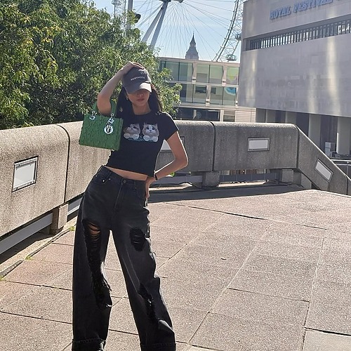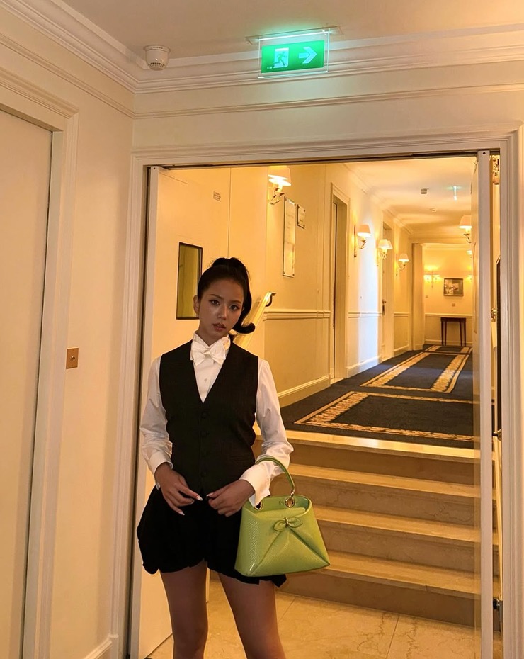 지수는 클래식한 디올 수트에 페미닌한 감성을 더한 룩을 선보였습니다. 깔끔한 화이트 셔츠에 보타이를 매치하고, 차콜 베스트와 블랙 쇼츠로 세련된 앙상블을 완성했죠. 민트 그린 핸드백으로 포인트를 주는 것도 잊지 않았고요.