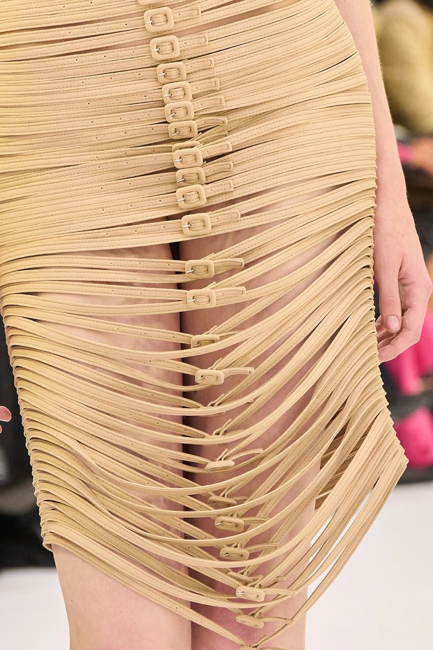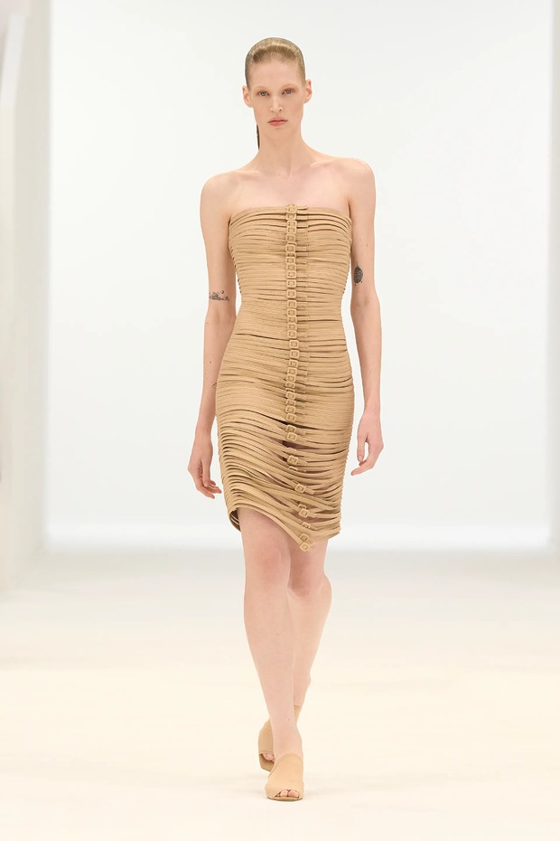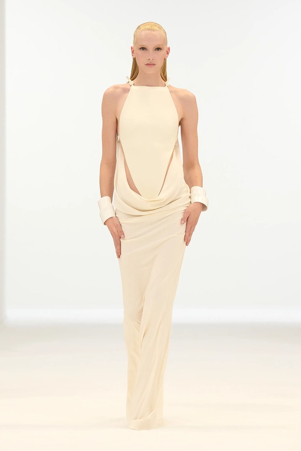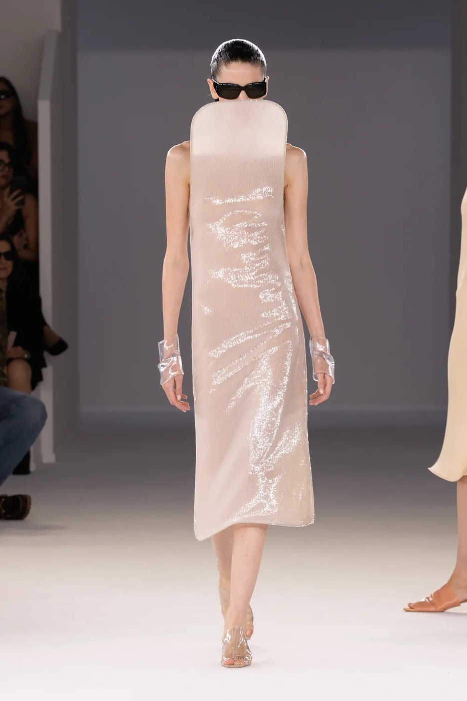 좁은 벨트 여러 개로 만든 룩은 젖은 듯 광택감을 내뿜었고, 지구 온난화에 대한 디 펠리체만의 감각을 표현한 것이었죠. 그는 “계속 증식하고, 녹아내리는 것 같죠. 햇빛이 강할수록 색은 따뜻해지고, 결국 투명해져 사라져버리기도 하고요. 햇빛이 강하면, 사실 뭘 보고 있는지조차 잘 안 보이잖아요”라고 이를 설명했습니다. 불투명한 솔라 페이스 실드로 얼굴을 가린 드레스는 우리가 직면한 현실을 이야기하는 듯했습니다. 앙드레 꾸레주의 퓨처리즘에 충실했지만, 그 시대처럼 마냥 낙관할 순 없었죠.