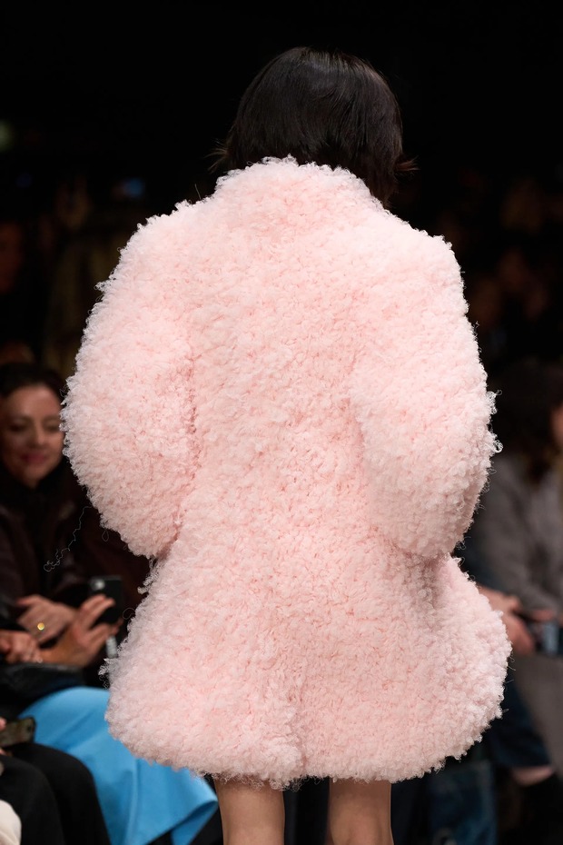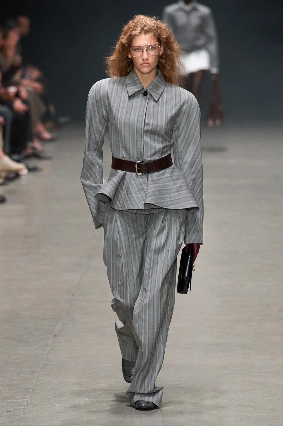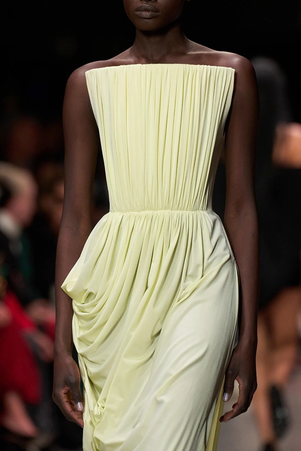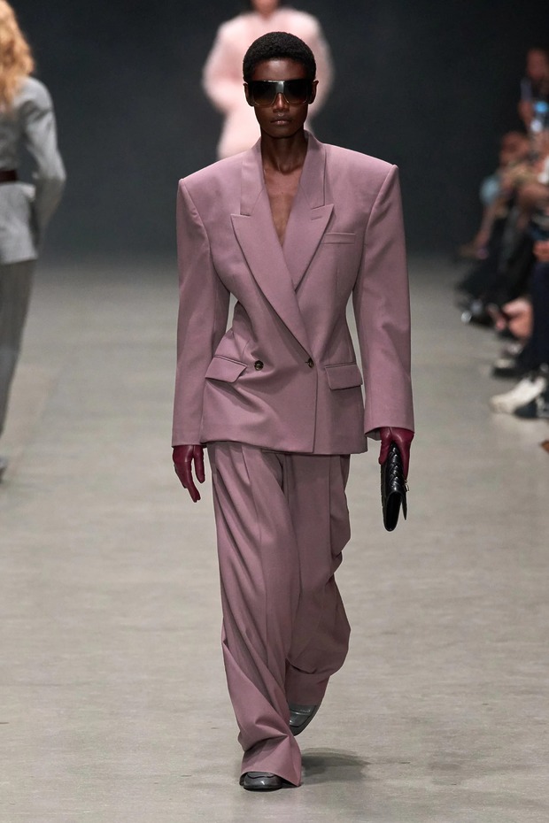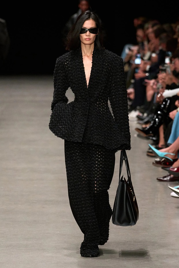 좁은 벨트 여러 개로 만든 룩은 젖은 듯 광택감을 내뿜었고, 지구 온난화에 대한 디 펠리체만의 감각을 표현한 것이었죠. 그는 “계속 증식하고, 녹아내리는 것 같죠. 햇빛이 강할수록 색은 따뜻해지고, 결국 투명해져 사라져버리기도 하고요. 햇빛이 강하면, 사실 뭘 보고 있는지조차 잘 안 보이잖아요”라고 이를 설명했습니다. 불투명한 솔라 페이스 실드로 얼굴을 가린 드레스는 우리가 직면한 현실을 이야기하는 듯했습니다. 앙드레 꾸레주의 퓨처리즘에 충실했지만, 그 시대처럼 마냥 낙관할 순 없었죠.