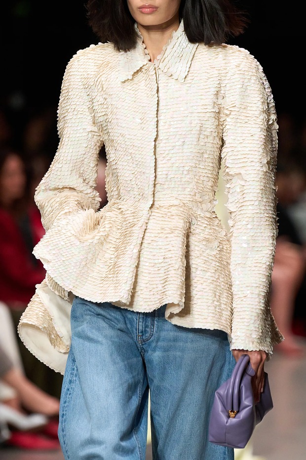 허리를 꼭 조이는 페플럼 형태의 재킷에 통 넓은 와이드 팬츠와의 만남, 조각된 보디스와 극적 대비를 이룬 그리스풍 드레이핑 이브닝 드레스는 대립적인 요소는 반드시 섞이고 융화돼야 함을 이야기합니다. 패션의 친환경, 지속 가능성을 중시하는 스텔라 맥카트니는 이번에도 생분해성 시퀸을 만들고, 공기를 정화하는 퓨어테크(PureTech) 원단 데님을 사용했으며, 깃털은 식물성 소재인 페버스(Fevvers)로 만들었죠. 즉 소재로는 인간과 자연을, 디자인으로는 인간 내부의 갈등을 봉합하려는 노력이었습니다. 동시에 현실이 아무리 암울해도 인간은 창의성을 바탕으로 기쁨으로 나아가야 한다는 쇼로 보였죠. 그러니 우린 맥카트니와 ‘컴 투게더’ 할 수밖에요.