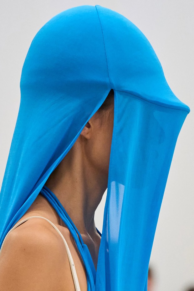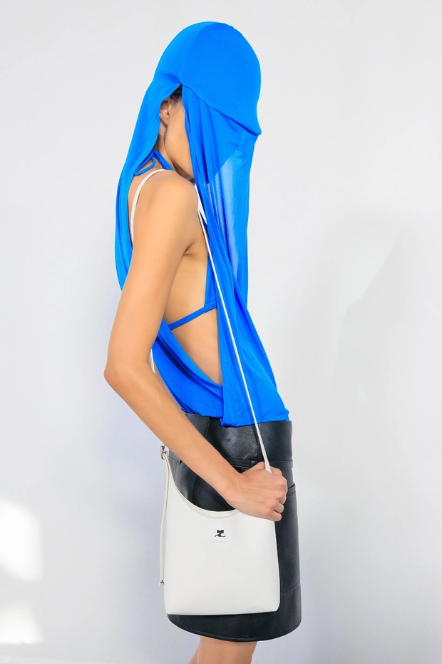 베일처럼 보이는 얼굴 가리개는 종교와는 상관없습니다. 자외선 차단 기능을 가진 아이템이죠. 니콜라 디 펠리체가 태국 여행에서 발견한 아이템에서 영감을 받았다고 밝혔고요. 컬렉션명인 ‘Blinded by the Sun(태양에 눈멀다)’과 연결됩니다. 올여름은 40도가 넘는 날이 많았고, 오늘날의 폭염 속에서 꾸레주가 할 수 있는 대답을 내놓고자 했죠. 노출과 절묘한 커팅 감각을 뽐내면서요. 마름모꼴로 잘린 보디수트, 어깨부터 손목까지 소매가 잘려나간 라이더 재킷, 뒤쪽에서 보면 롱스커트로 보이는 쇼츠나 팬츠 등이 그 예였고요.