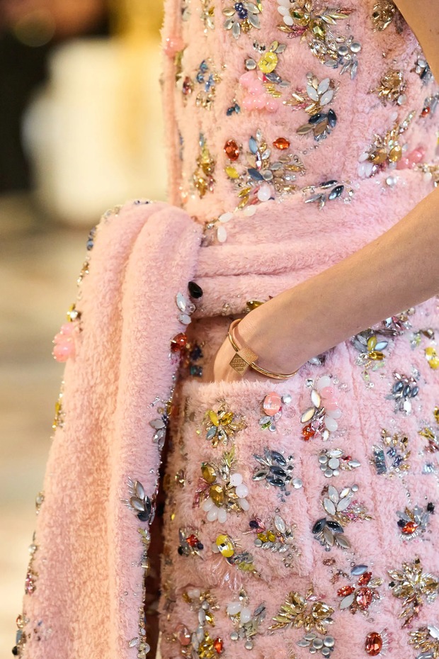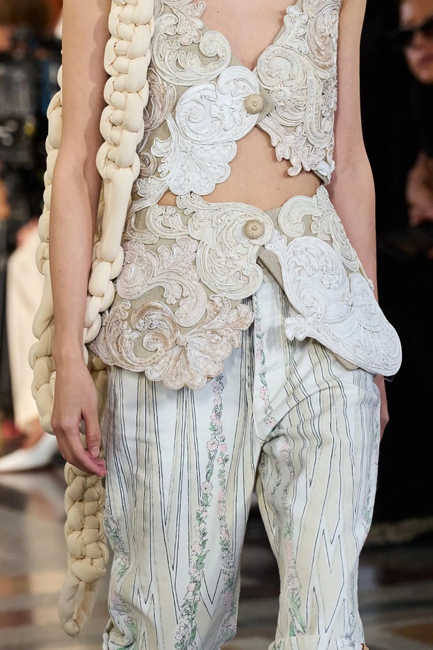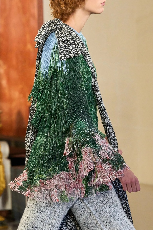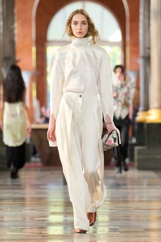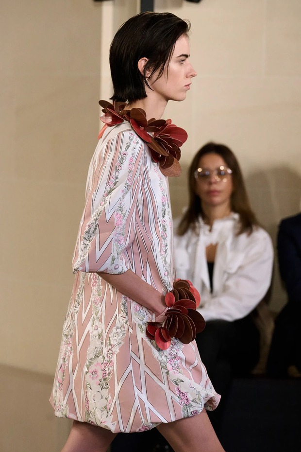 파이핑이 들어간 캐미솔, 팬츠, 로브로 시작된 건 어찌 보면 당연했습니다. 집에서도 예뻤으면, 편안했으면 싶으니까요. 하지만 쇼가 진행될수록 오래된 초상화에서 볼 법한 레이스 러프보다는 집 전체에서 영감을 받은 듯한 요소가 눈에 띄었습니다. 탁자 다리 장식을 닮은 듯한 주름 모양 톱, 벽지에서 따온 듯한 프린트 슬립이나 셋업, 드레스나 팬츠 솔기를 따라 장식된 나무 원반 같은 것이었죠. 벽에 걸린 인상파의 풍경화나 창밖 풍경이 연상되는 비즈 장식 프린지 드레스나 셋업도 안락함을 표현할 만했고요. 자, 이제 우리는 루이 비통의 집 안으로 들어가면 됩니다. 부드럽고 포근한 그 순간은 자기 자신으로 만들 테니까요. 쇼장을 메우던 토킹 헤즈의 ‘This Must Be the Place’ 가사처럼요.