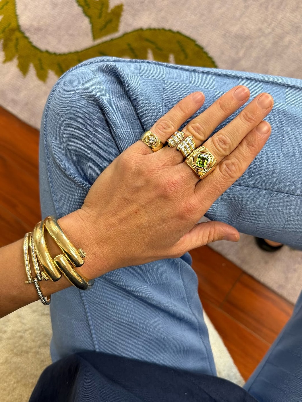디자이너 진 프루니스(Jean Prounis)는 핑키 링을 두고 “룩에 마침표를 찍는 장치, 진실의 닻과 같은 존재”라고 표현했습니다. 핑키 링 예찬론자인 그녀는 5개의 핑키 링을 돌려가며 착용하는데, 선택은 매일의 기분에 따라 달라진다고 합니다. “진지한 대화나 회의가 있는 날에는 가닛을, 좋은 기운이 필요할 땐 스타 사파이어를, 차려입고 외출하고 싶은 날에는 핑크 사파이어를 선택하죠.” 프루니스는 핑키 링이 시계와도 잘 어울린다고 말했습니다. “살짝 보이시하면서도 정제된 느낌의 균형이 생겨요. 아주 멋지죠.”