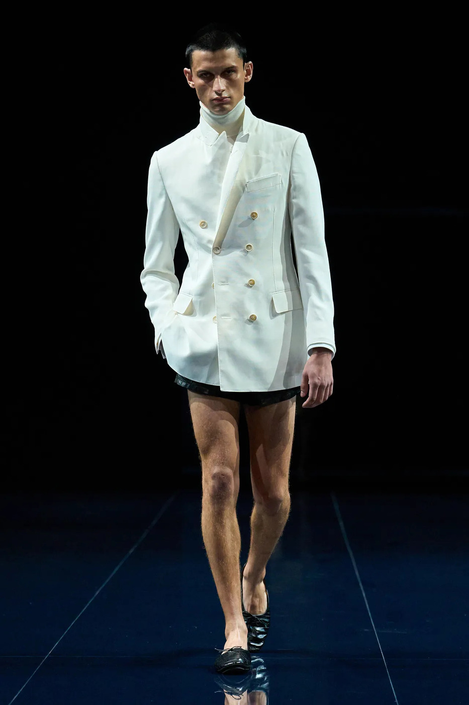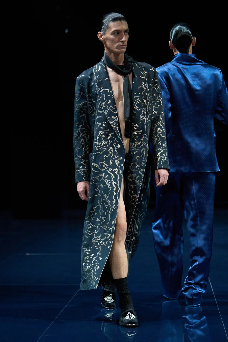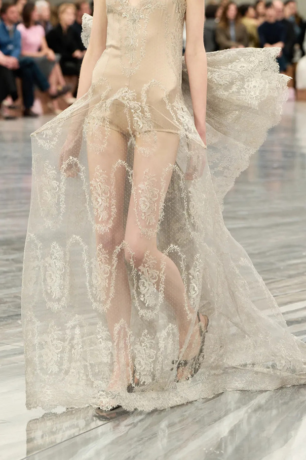 하이더 아커만은 ‘자정의 바다 수영’이라는 테마로 톰 포드를 풀어냈습니다. 깜깜한 바닷빛이 감도는 가운데 위험과 매혹의 공기를 채웠죠. 수영복은 없었지만, 트라이앵글 브라 톱과 시어 쇼츠, 그 아래로 드러난 조크스트랩이 긴장감을 더했습니다. 철사 구조 드레스와 비대칭 스트랩 드레스는 중력을 거스르는 듯한 과감함으로 무대를 흔들었고, 몇몇 룩은 루디 건릭의 모노키니를 소환하며 섹슈얼의 계보를 명확히 이어갔습니다.