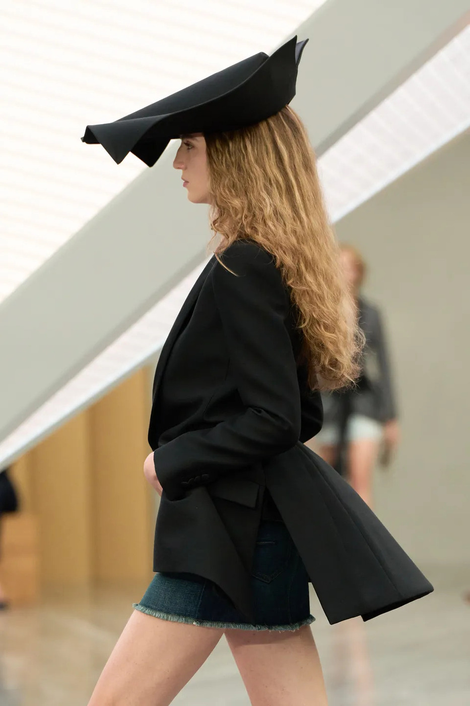곳곳에 디올의 상징이 가득했습니다. 첫 룩으로 등장한 흰색 플리세 램프셰이드 드레스는 디올의 뉴 룩을 환기하며 흔한 A 라인, H 라인의 반복을 피했습니다. 이어 등장한 바 재킷은 남성복에서 먼저 시도했던 테일러링을 인형 옷처럼 축소한 버전이었죠. 모자는 갈리아노식 드라마를 빌려오며 패션 팬들에게 반가운 울림을 남겼습니다. 키우리의 실용 중심 시대와 결별을 선언하는 장면이었고요. 물론 대중성을 겨냥한 아이템도 있었습니다. 특히 남녀 모두 입을 수 있는 셔츠, 데님 팬츠, 니트 케이프, 카고 쇼츠가 눈에 띄었죠.