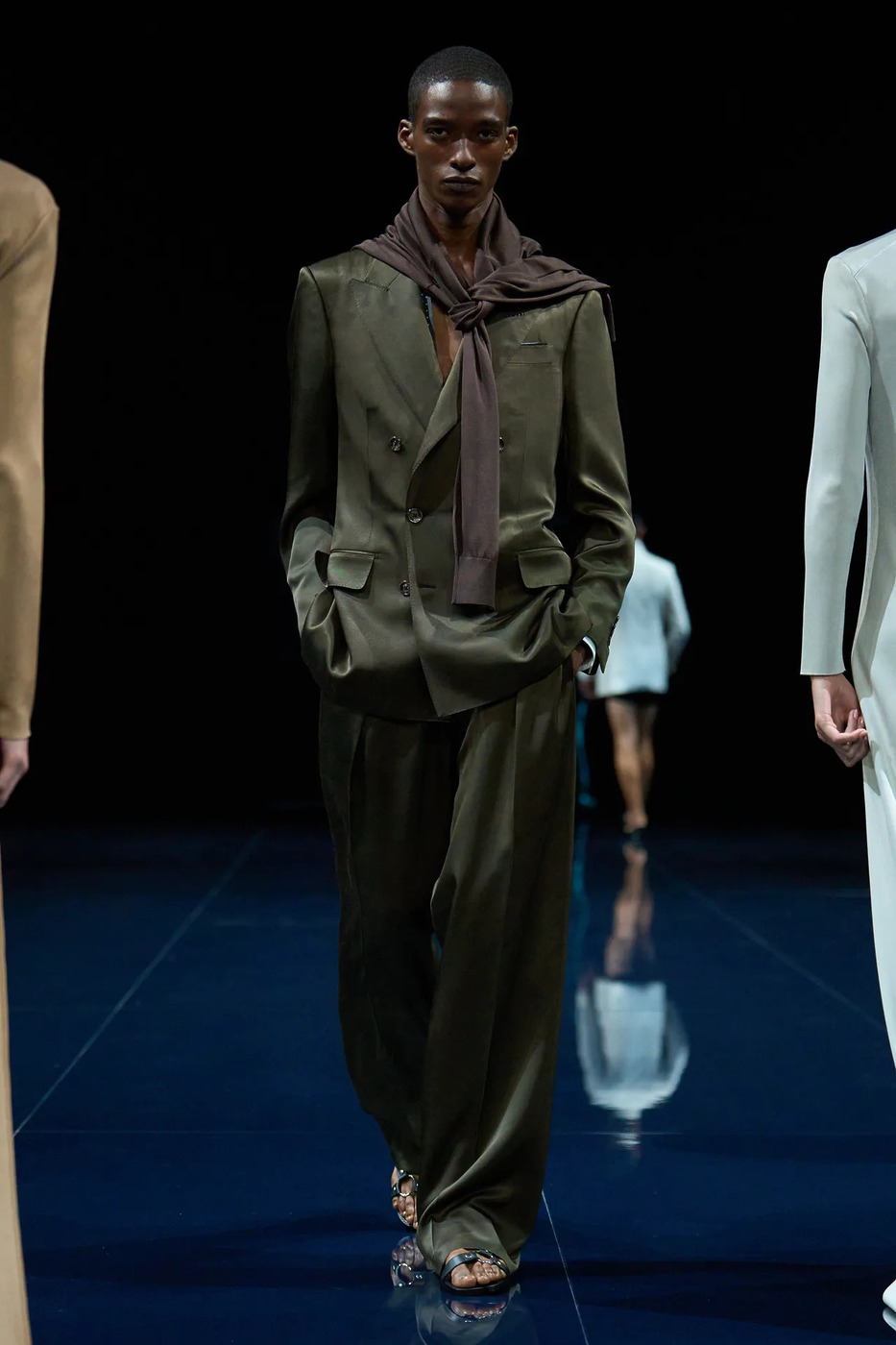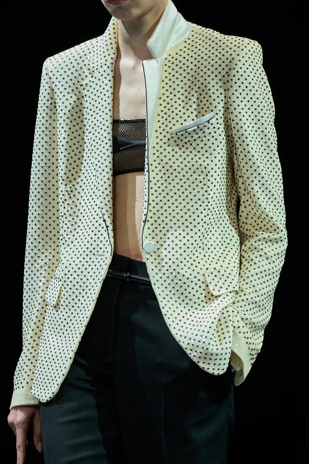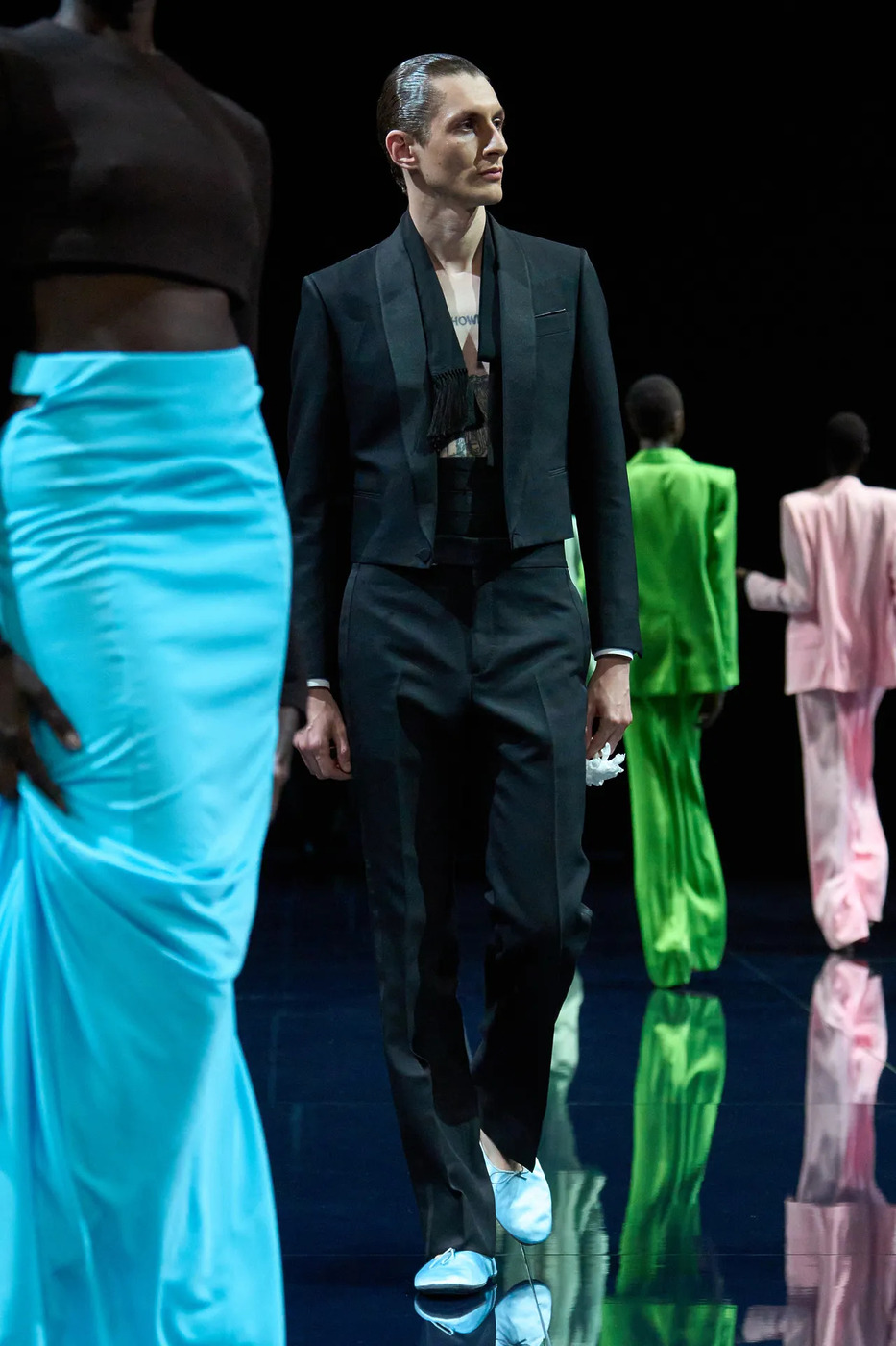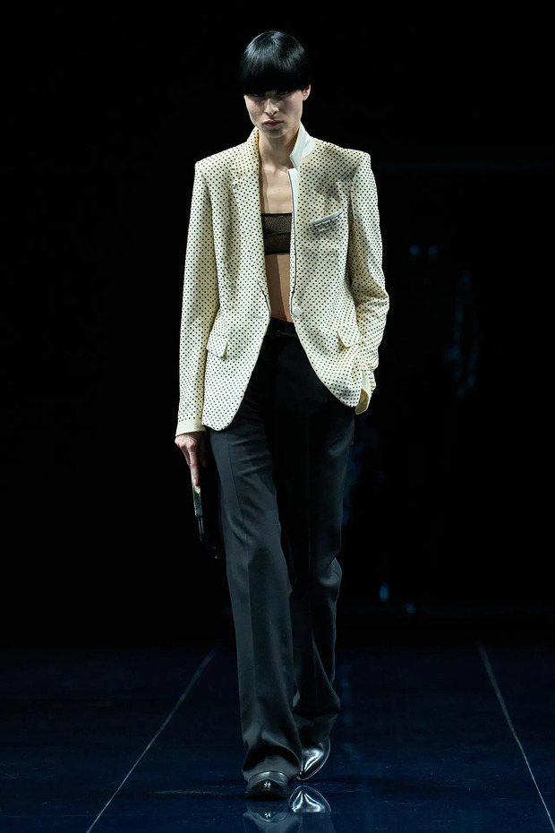톰 포드의 세계로 먼저 넘어간 모델들이 관객을 이끈 점도 한몫합니다. 무표정을 거두고 관객과 옆 모델에게 곁눈질하며 유혹했죠. 노출만으로 채우지 않겠다는 다짐이었습니다. 은근한 시선과 호흡, 타이밍이 관능미를 심화했죠. 톰 포드가 남긴 영화적 감각을 계승하면서도, 하이더 아커만 특유의 아찔함을 더한 무대였습니다.