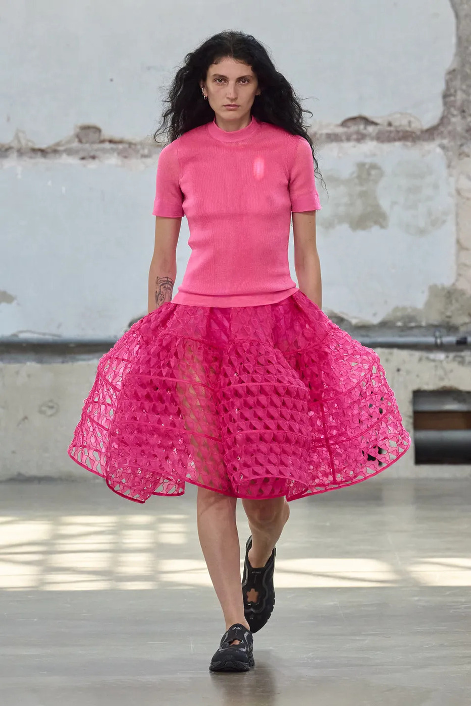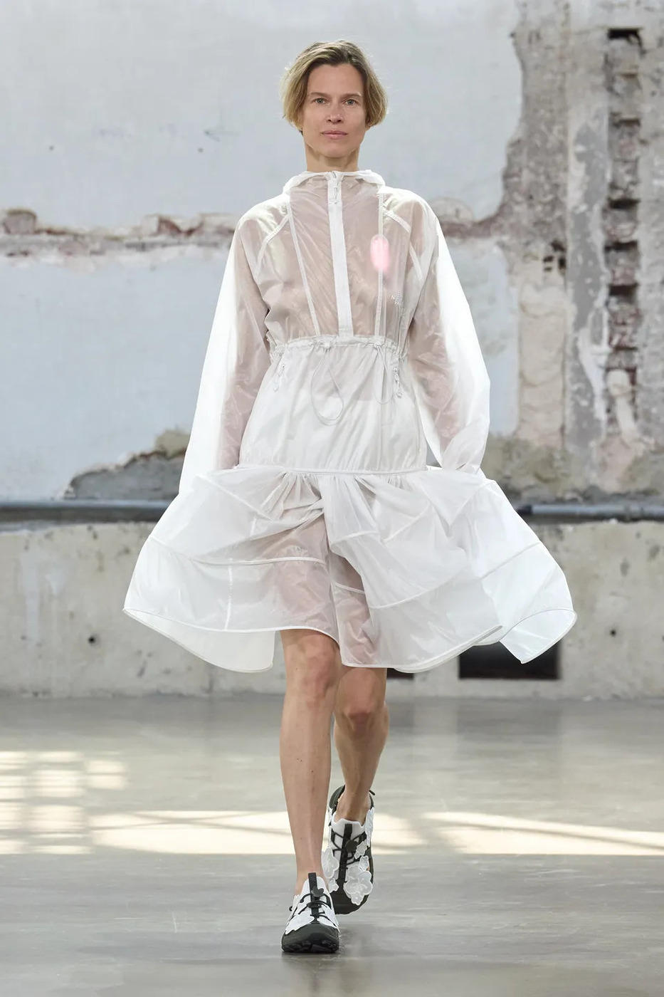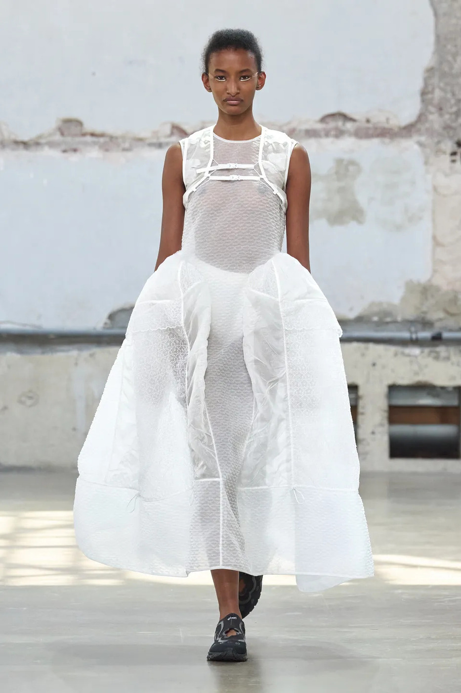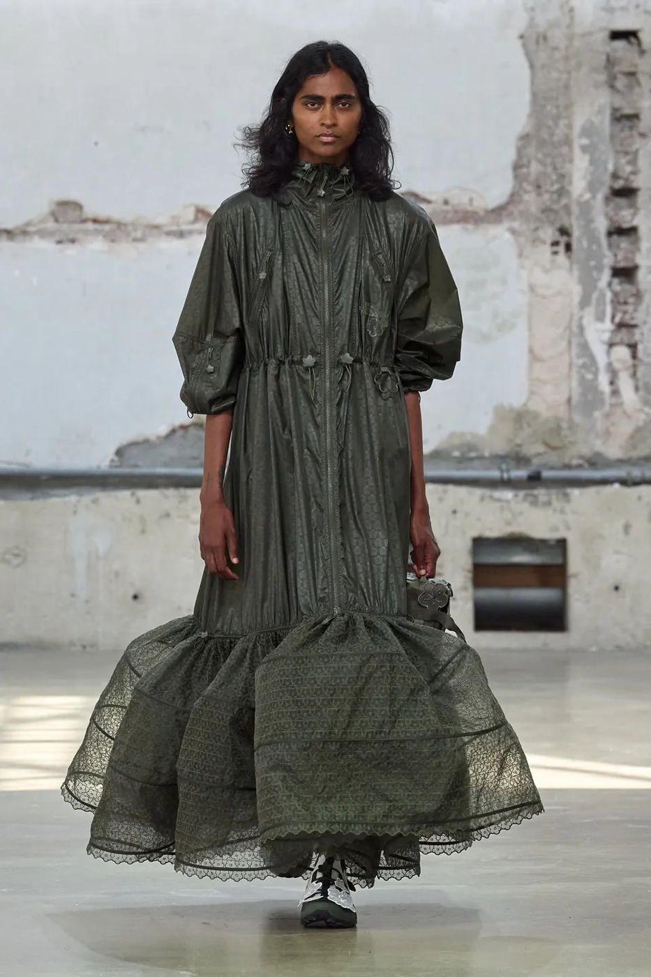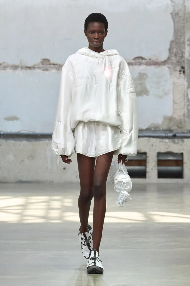 세실리에 반센의 이번 시즌은 이름 그대로 ‘Heartfelt(진심 어린)’ 무대였습니다. LED 하트가 박동하듯 빛나는 드레스, 바람처럼 부풀었다 가라앉는 드레스는 여전히 특유의 낭만을 간직했습니다. 핫 핑크와 선명한 레드가 더해져 컬러 스펙트럼도 넓어졌죠. 하지만 달콤함에 머물지 않았습니다. 나일론 스트랩, 카라비너, 방수 립스톱 소재, 해체된 마운틴 재킷이 페미닌한 스커트와 엮이며 낭만을 단단하게 붙잡았습니다. 풍성한 주름 속에 숨은 포켓은 실용성과 의외성을 동시에 담았죠.