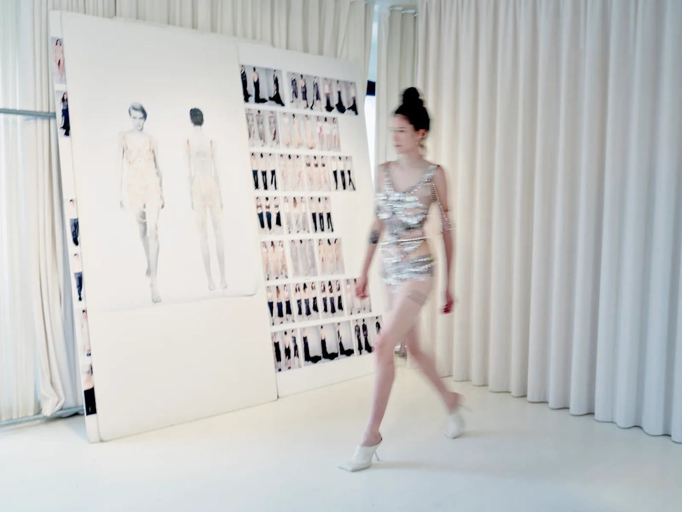 “무드보드에 키워드 넣는 걸 좋아합니다.” 프레이타스가 말했죠. “키워드를 보면 이미지만큼 컬렉션 분위기가 떠올라요. 제겐 매우 감각적인 요소죠.” 무드보드에는 영화에 대한 그의 관심사가 드러나 있었습니다. 몇 가지를 소개하면 키치한 매력(Kitsch Glamour), 스타더스트(Stardust), 시적 캠프(Poetic Camp), 야행성(Nocturnal), 순수한 맥시멀리즘(Purist Maximalism)… 여기에 헬무트 뉴튼이 촬영한 쇼걸 같은 보디수트 차림의 에바 헤르지고바의 사진과 더불어, 엉덩이를 쭉 내민 자크 파트(Jacques Fath) 칵테일 드레스, 주디 갈랜드, 기괴한 한스 벨머(Hans Bellmer)의 예술품, 코르셋 장인 미스터 펄(Mr. Pearl), 1990년대 마르탱 마르지엘라(이건 예상 못했을 것!), 제인 맨스필드(Jayne Mansfield, 그는 최근 마리스카 하지테이(Mariska Hargitay) 다큐멘터리를 좋아했고, 이제는 철거된 맨스필드의 옛 집 핑크 팰리스에 집착한다), 그리고 1996년 데이비드 심스가 촬영한 존 갈리아노의 찌그러진 크리놀린 드레스 차림의 기네비어 반 시누스(Guinevere Van Seenus) 사진(이것도 예상 못했을 것이다) 등이 꽂혀 있었습니다.
