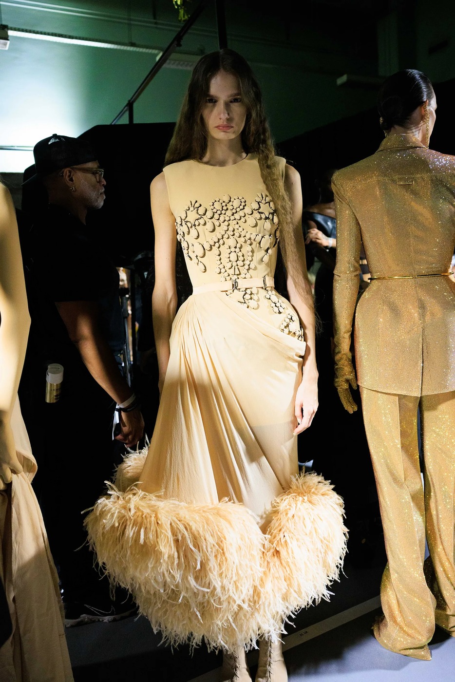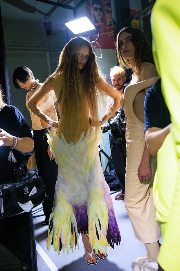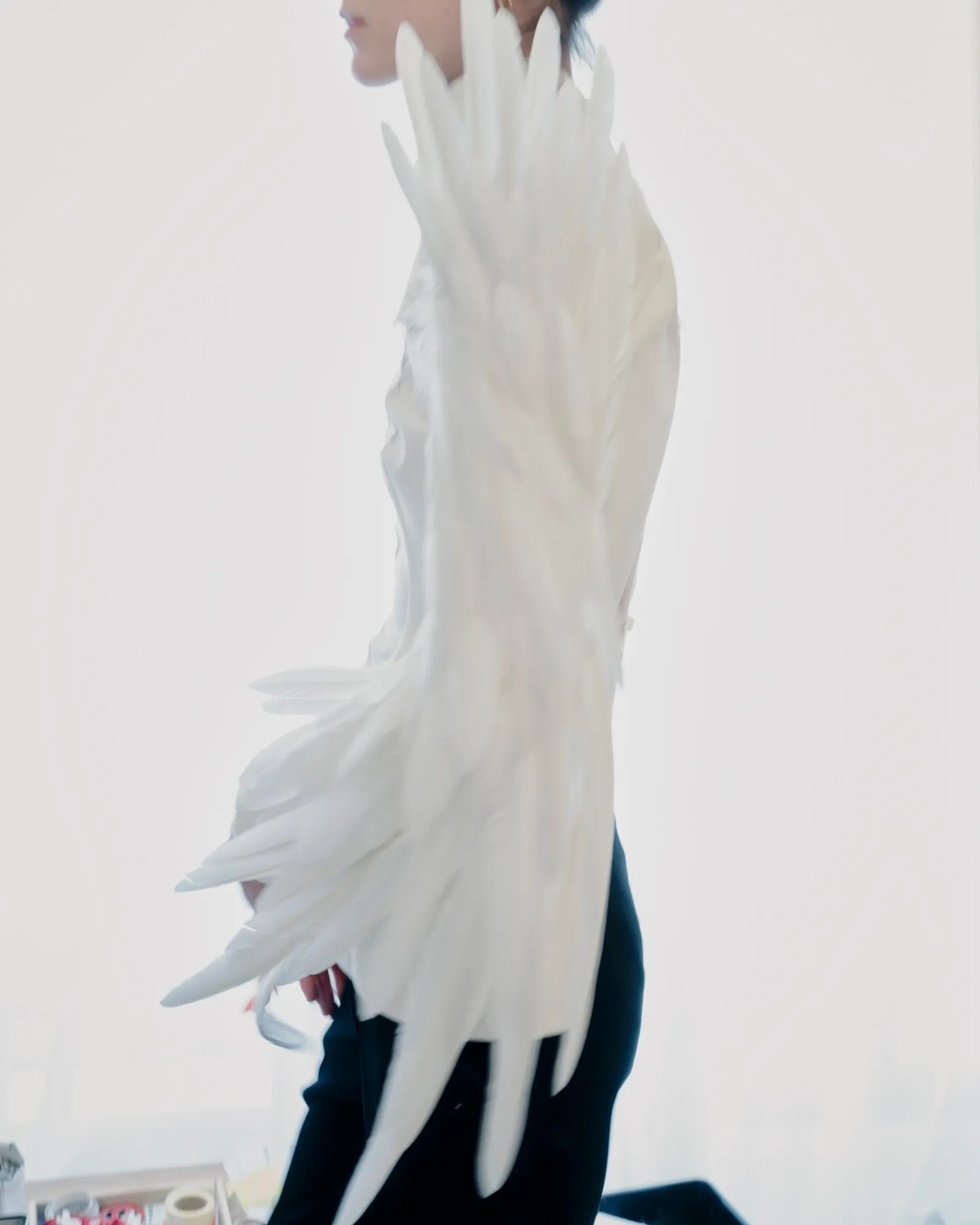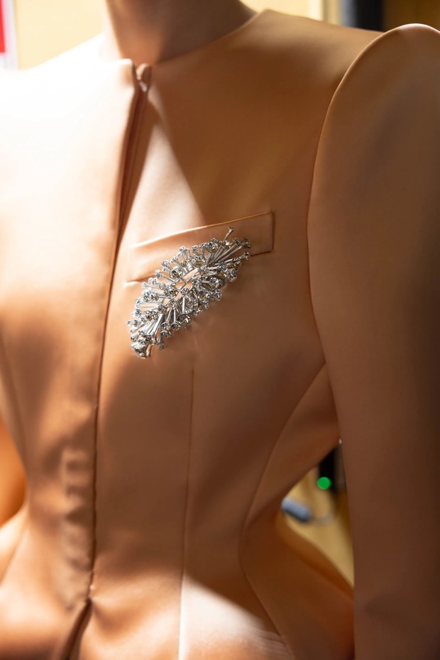 그의 사무실을 나와 컬레션을 보았습니다. 모퉁이에 린다 에반젤리스타가 조지 마이클의 1992년 히트곡 ‘Too Funky’ 뮤직비디오에서 착용한 깃털 머리 장식이 놓여 있습니다. 뮈글러가 연출한 뮤직비디오였죠. “써봤나요, 미겔?” 그가 웃음을 터뜨렸습니다. 이건 긍정의 무응답이겠죠? 한편, 그는 걸려 있는 옷에 자부심이 있었습니다. 뮈글러의 유산을 가져와 뒤집은 것에 자부심을 느꼈죠. 무겁던 때도 있었지만, 이제는 모든 것이 가벼워졌습니다. 반짝이던 것이 여전히 장식적이지만 지금은 매트하고 그래픽적이며, 테일러링으로 착용하죠. (프레이타스는 티에리 뮈글러와 함께 일한 주얼리 장인과 협업 중입니다.) 깃털은 1950년대 파우더 퍼프나 토이 푸들 색상과 같지만, 그 모든 드라마에도 절제와 엄격함이 깃들어 있습니다. (그는 이 깃털 룩을 물랑루즈 뒤에 있는 메종 페브리에(Maison Fevrier)에서 만들었다고 언급했습니다.)
