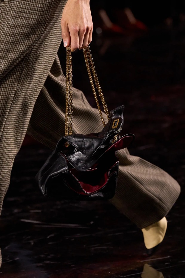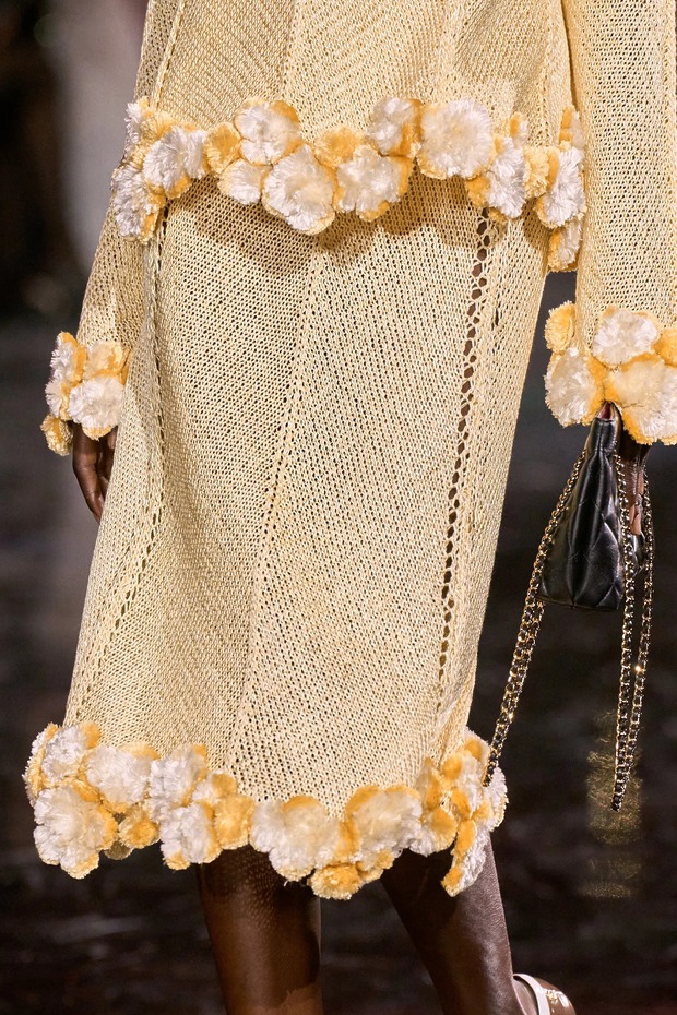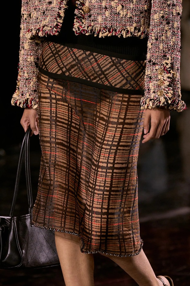 관습 깨기는 로우 라이즈 스커트와 팬츠 위로 삐죽삐죽 튀어나온 골지 코튼 밴드에서도 나타납니다. “코코 샤넬이 처음으로 저지 원단을 발견해 마리니에르(Marinière) 톱을 만들었을 때, 그 소재는 원래 속옷용이었어요. 그리고 개인적인 이유도 있죠. 제 할아버지가 남성 속옷 공장에서 일했거든요.” 속옷 디테일은 컬렉션의 중추에 현대적인 감각도 더했죠. 2.55 백의 플랩 안에 와이어를 넣어 사용자가 원하는 대로 조형하도록 자율성을 부여한 것이죠. 블라지는 이 백을 낡지 않은 것처럼, 오랫동안 사랑받은 것처럼 보이게 하는 것이 목표였다고 말했습니다. 그는 모든 것을 해체했지만, 모든 것을 샤넬로 보이게 했죠. 아주 간단하게, 자신의 방식으로요.