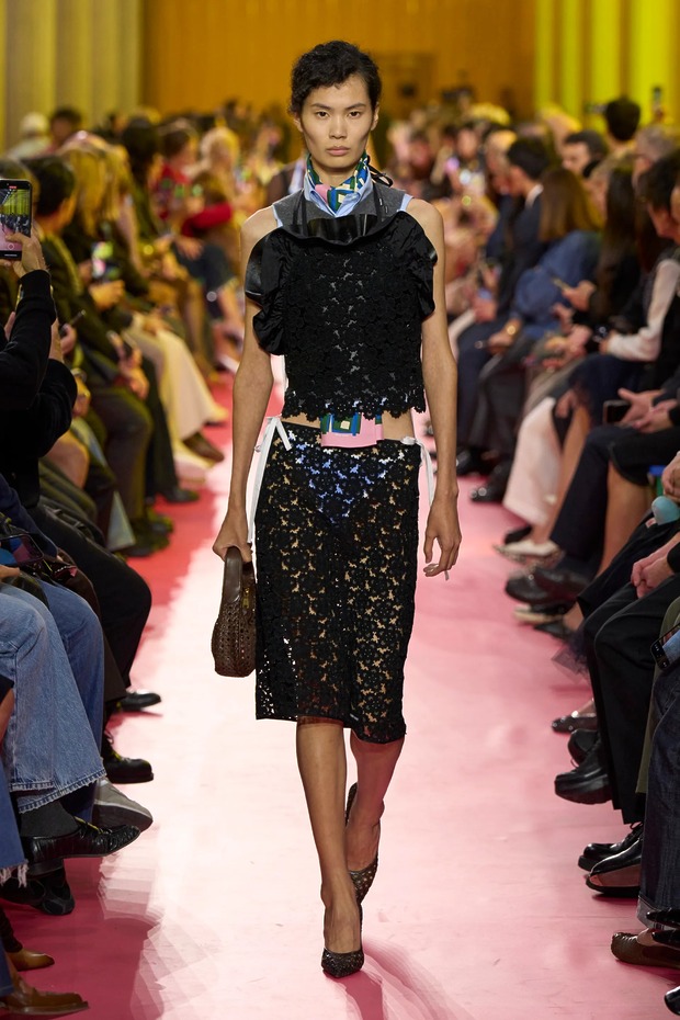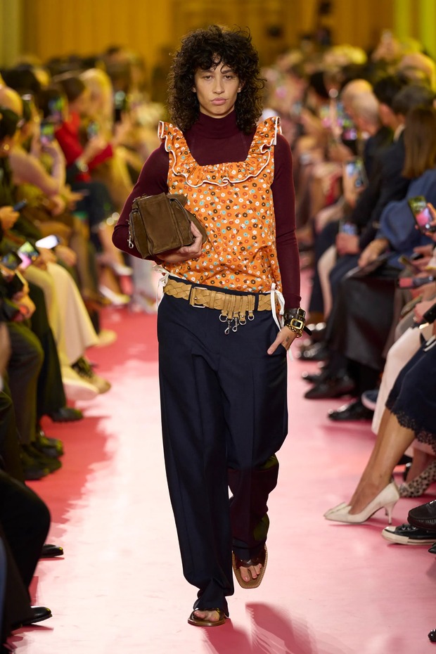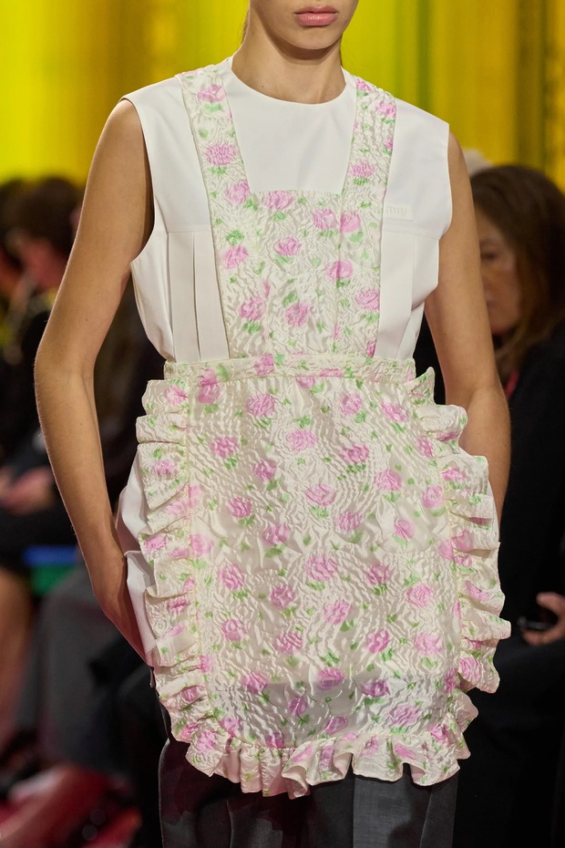 쇼 오프닝은 배우 산드라 휠러가 장식했습니다. 그녀는 공장 노동자가 입는 유틸리티 앞치마를 두르고 주머니에 손을 찔러 넣은 채 등장했죠. 보이지 않는 손길의 청소 노동자와 가사 도우미에게도 주목했고요. 부엌에서 일하던 어머니, 할머니, 증조할머니, 사랑받았지만 그럼에도 종종 인정받지 못한 여성도 있었죠. 미우치아 프라다는 그런 현실을 런웨이에 올려 ‘패션’으로 만들었습니다. 튼튼한 워크 재킷과 코트부터 인더스트리얼 드릴 소재 팬츠로 시작해 익숙한 모습의 꽃무늬 앞치마, 식당 웨이트리스가 입을 법한 더블 니트 셔츠와 스커트까지, 크리스털이 달린 앞치마를 보면서 저는 한 가지가 우려됐습니다.