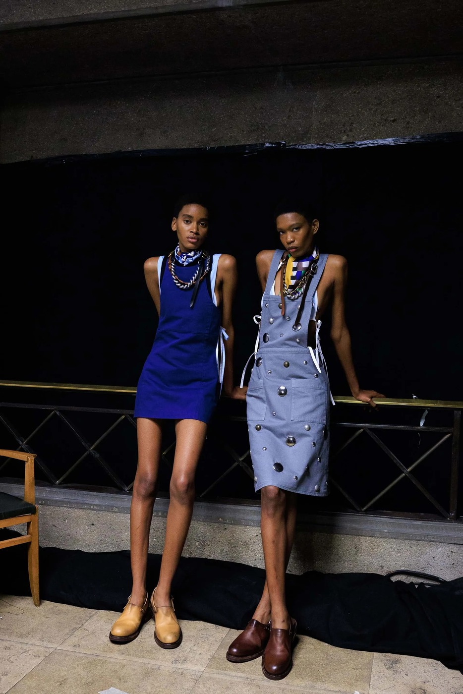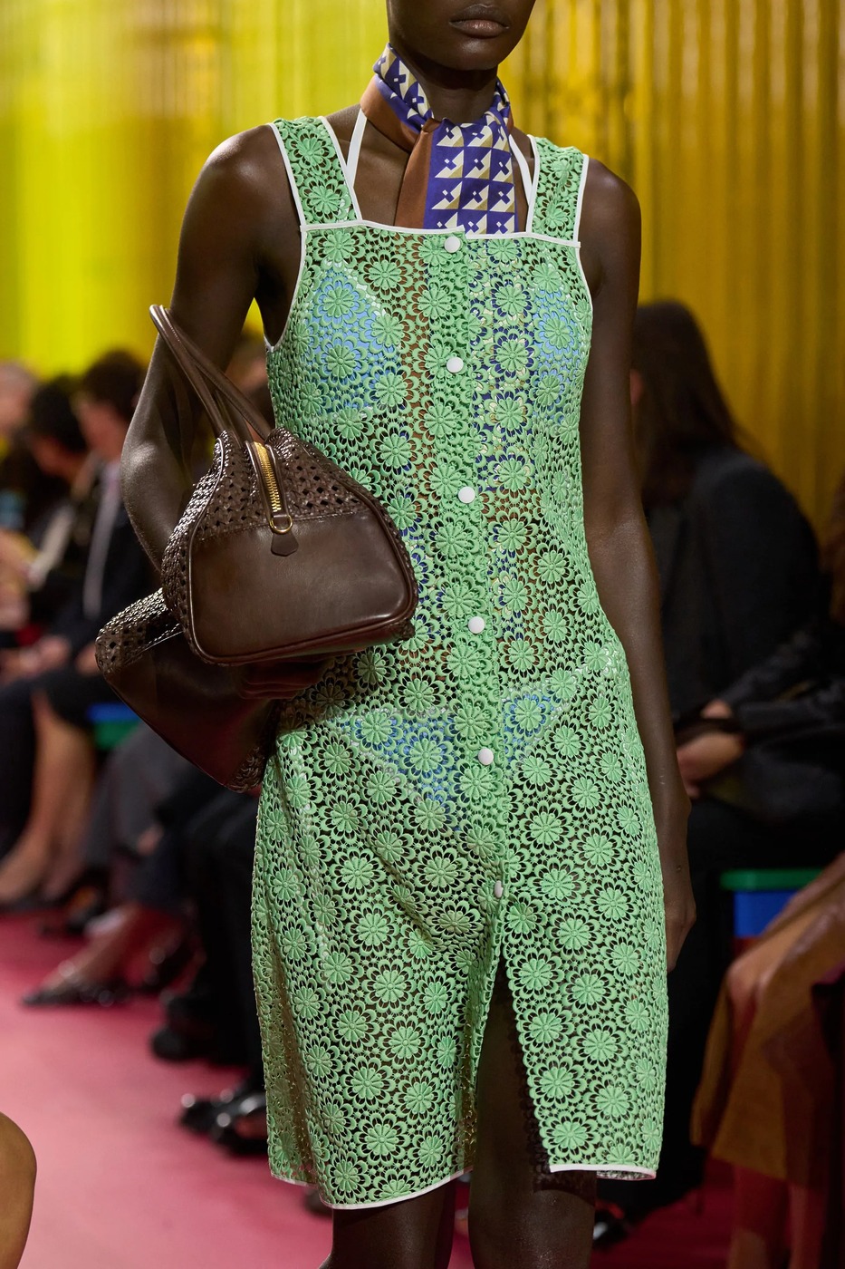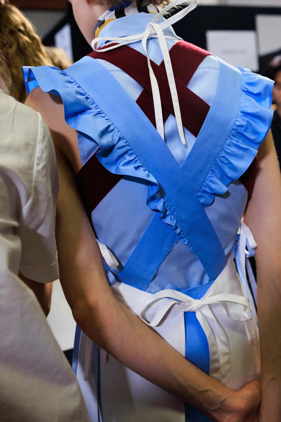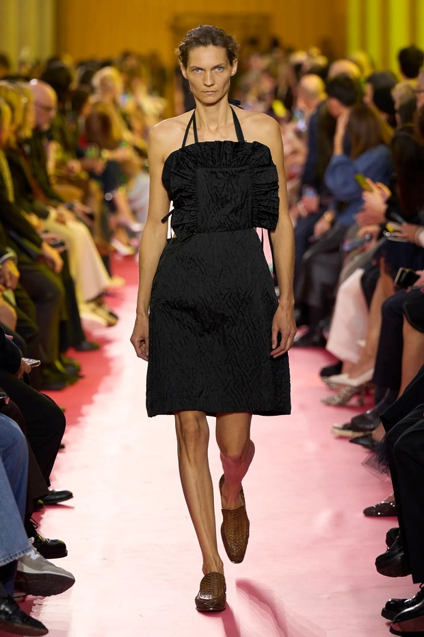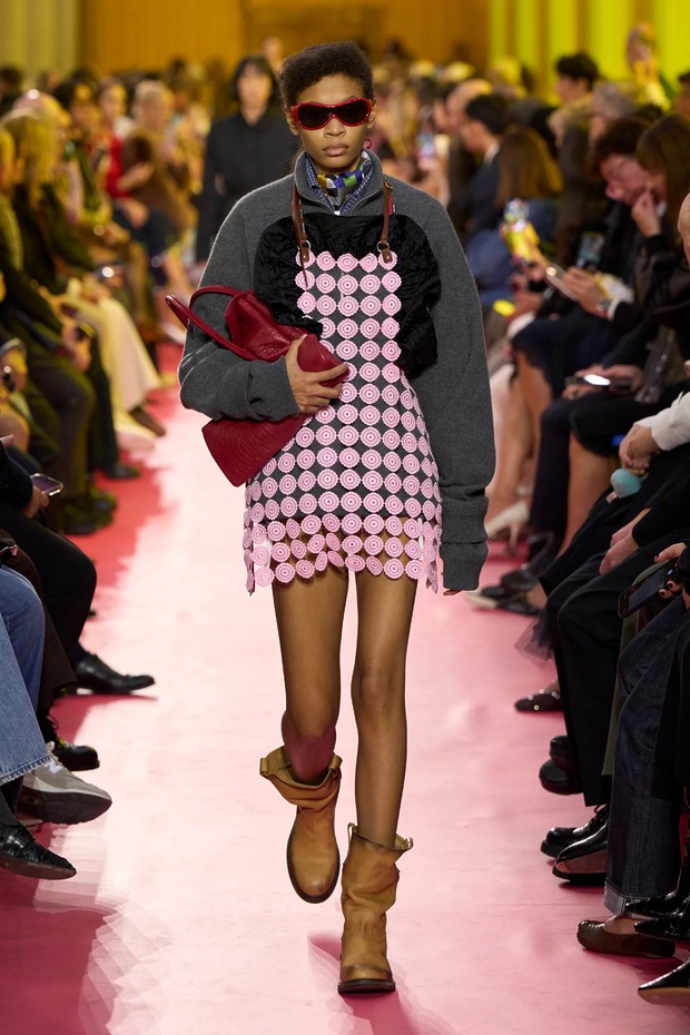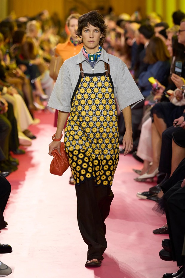 워크 재킷의 여자 버전이 있다면 그것이 앞치마일까요? 미우치아 프라다가 불릿 브라 대신, 앞치마를 선택했습니다. “패션은 늘 화려함이나 부유층의 이야기를 하죠. 하지만 우리는 인생이 얼마나 어려운지도 인정해야 해요. 앞치마는 공장에서부터 가정에 이르기까지 역사 속 여성의 고단한 삶을 담고 있습니다.” 런웨이의 세트는 공장 구내식당을 연상시켰습니다. 관객들은 멜라민 상판의 테이블 위에 걸터앉았고, 바닥은 붉은 고무로 덮여 있었죠. 그렇게 생각해서인지 공기에는 세제 냄새가 희미하게 배어 있었습니다.