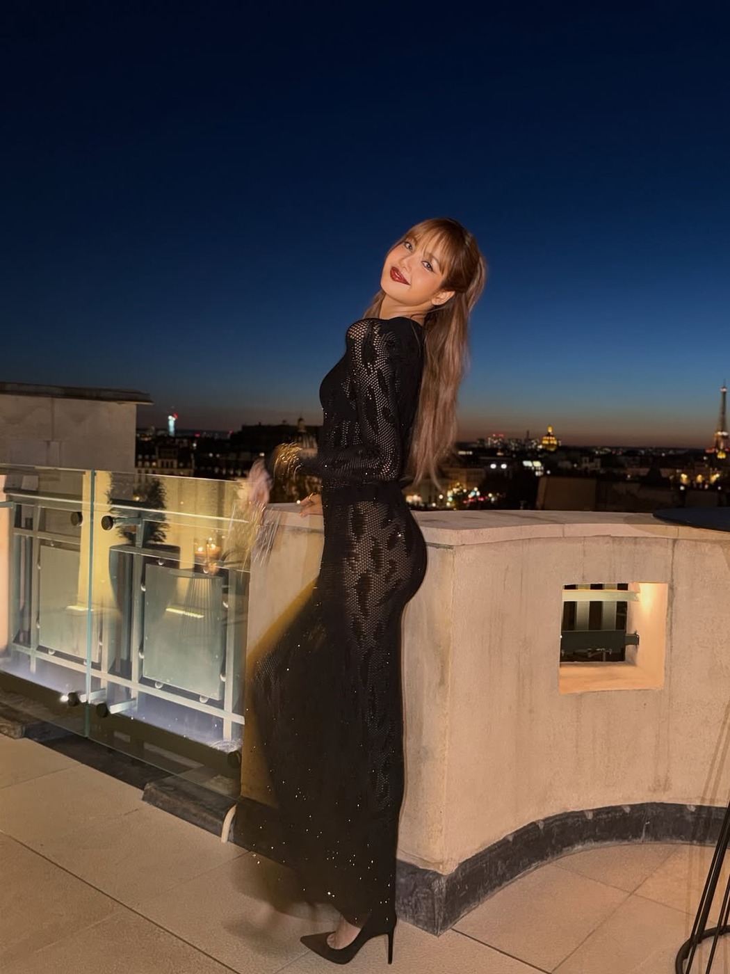 리사의 룩에서도 팬츠리스 실루엣과 레이스 소재를 볼 수 있어요. 낮에는 짜임이 살아 있는 니트 셋업에 미니 쇼트 팬츠를 입고, 얇은 카디건을 걸쳤습니다. 팬츠리스처럼 보이지만 허리에 와이드 벨트를 더해 안정감을 주었죠. 밤에는 시스루 블랙 롱 드레스로 갈아입으며 완전히 다른 무드를 냈습니다. 컬러풀한 낮과 대비되어 더 관능적이었죠.
