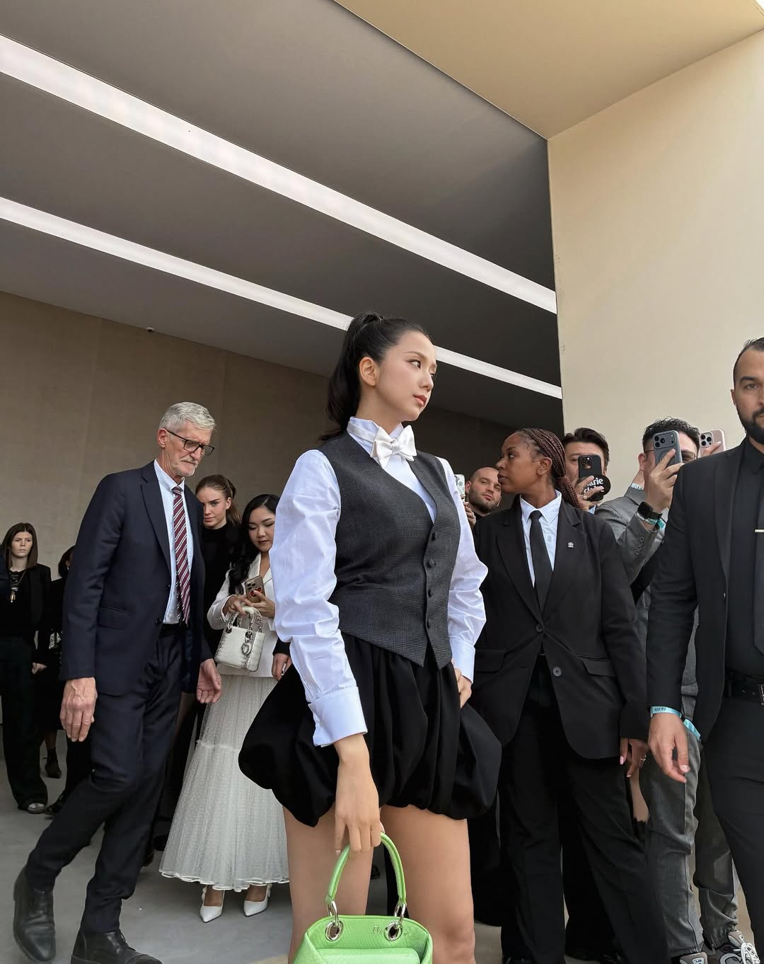 지수는 네 사람 중 가장 단정하면서도 현실적인 룩을 입었어요. 블라우스에 회색 정장 조끼, 검정 미니스커트, 여기에 보타이를 더해 예의 바른 디올 룩을 완성했죠. 언뜻 격식 있는 스커트 수트 룩처럼 보이지만 자세히 보면 캐주얼합니다. 스커트는 풍성한 벌룬 실루엣으로 귀여움을 더했고, 조끼는 이번 시즌 트렌드 아이템답게 단독으로도 활용할 수 있는 아이템이에요. 보타이를 빼면 바로 현실 출근 룩으로 이어질 만큼 응용 폭이 넓습니다. 블라우스 대신 티셔츠를 입어도 좋고요.