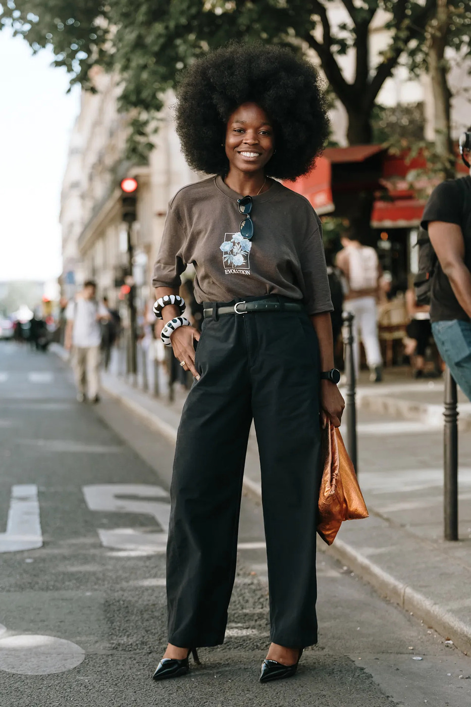 로고 티셔츠는 테일러드 팬츠의 엄격함을 상쇄해주는 똑똑한 아이템인데요. 위트 있는 문구나 프린트를 새긴 것이라면 더욱 재미있을 거예요.