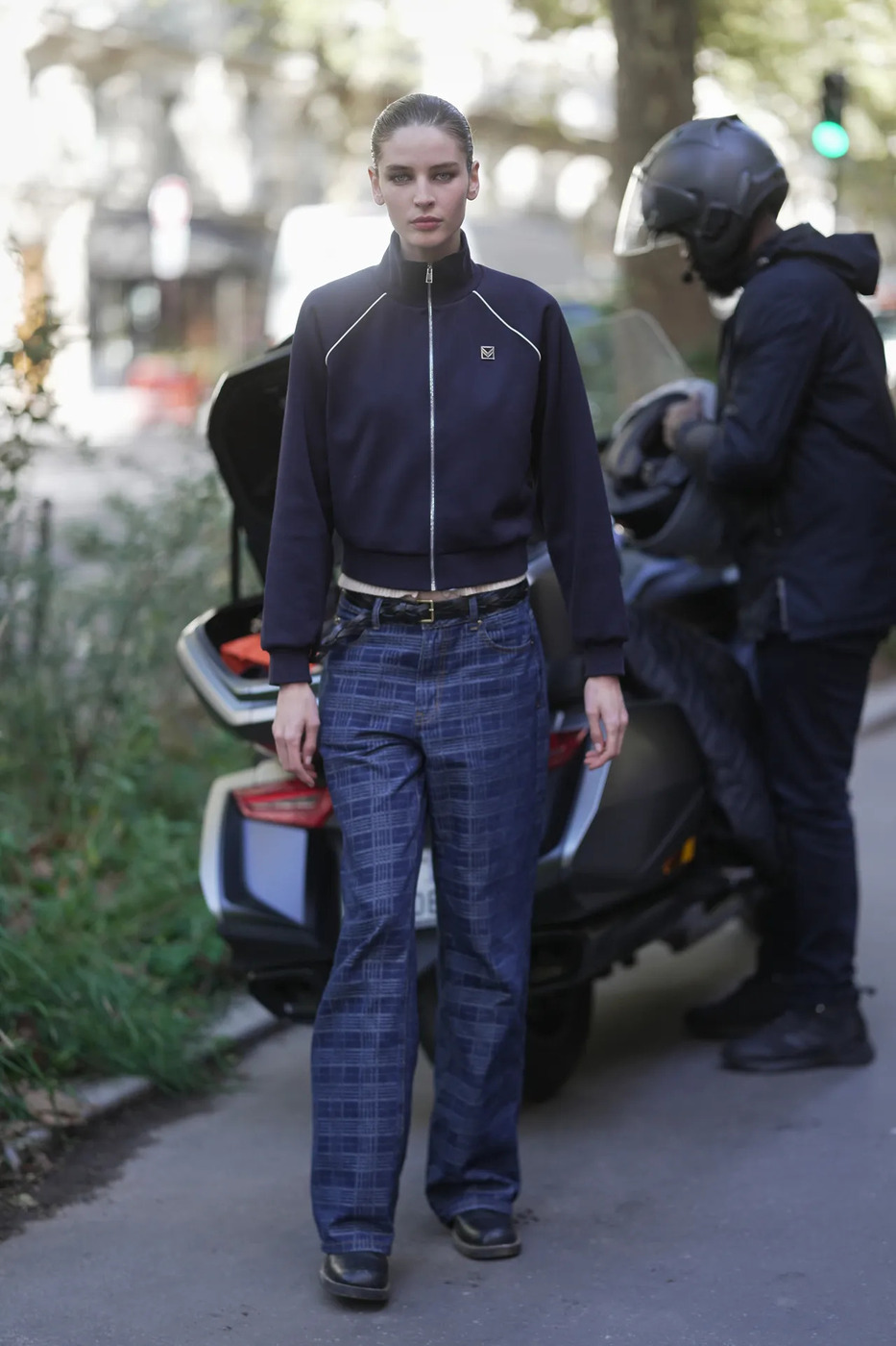 네이비 트랙 재킷에 체크 와이드 팬츠, 로퍼로 마무리하면 스포티와 프레피를 섞은 믹스 매치가 완성됩니다. 캐주얼한데 단정한, 런던 스트리트 특유의 규칙을 벗어난 스타일이랄까요?