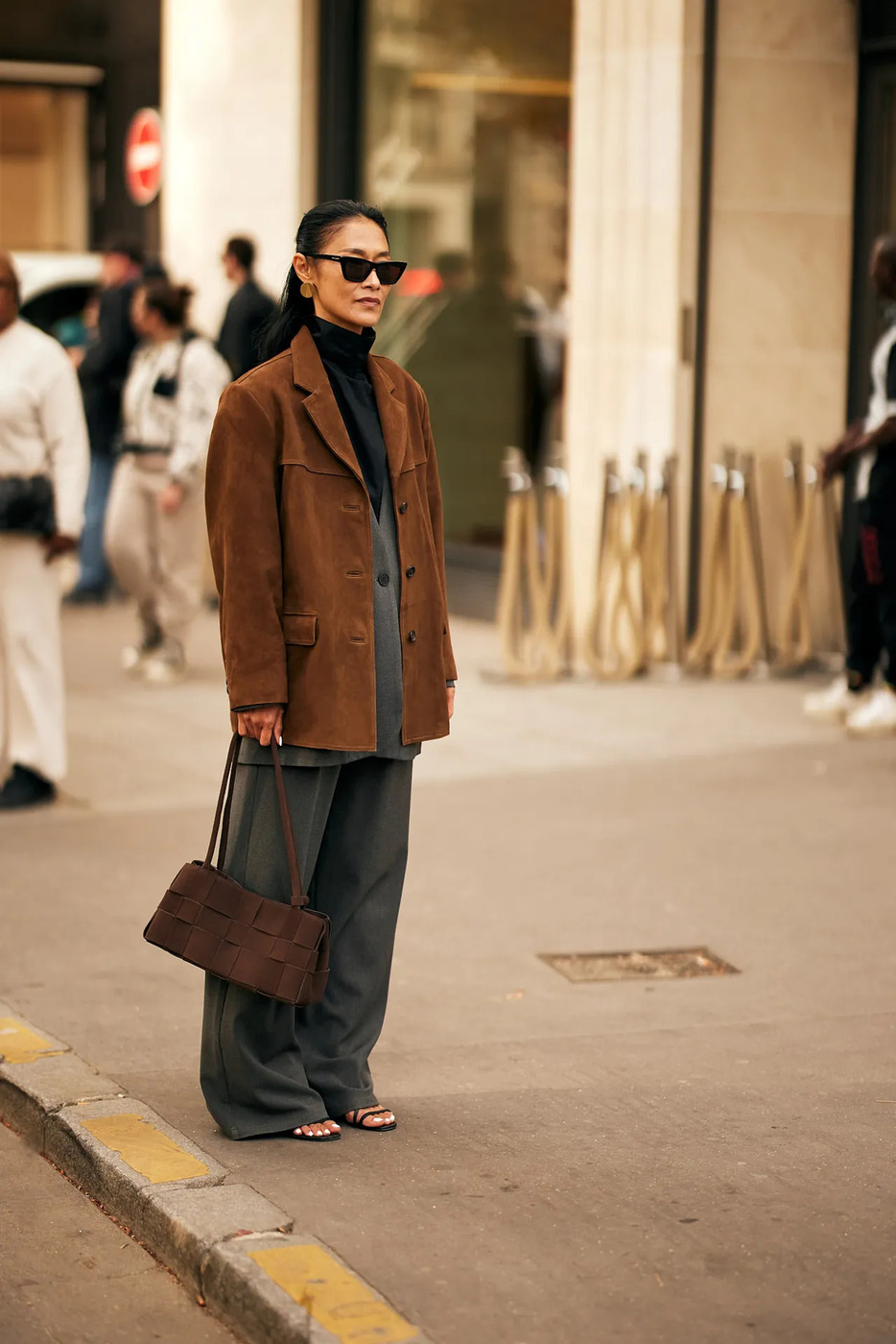 패션 위크 스트리트에서 가장 많이 목격된 브라운 스웨이드 재킷은 와이드 팬츠 수트 셋업 위에도 어김없이 등장했습니다. 포멀한 수트를 유연하게 풀어주니 인간미가 살아나는 듯하죠.