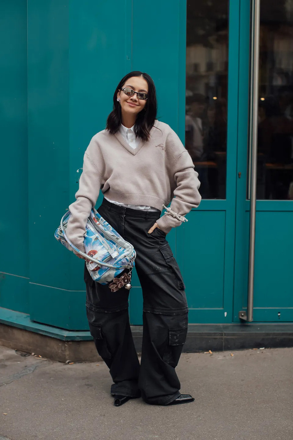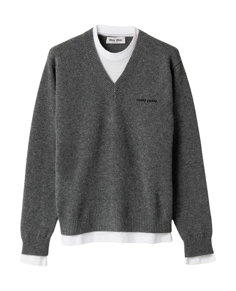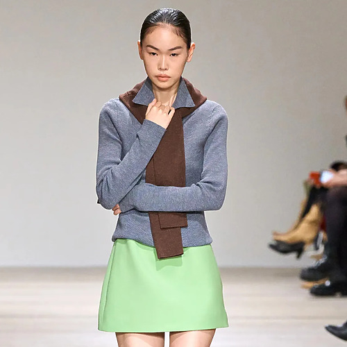 니트의 두께감에 따라서 전체적인 인상도 달라집니다. 야들야들하게 얇은 니트는 미우미우 특유의 감도를 살려 허리선 안쪽에 넣어 티셔츠 대신 입을 수 있고, 오버사이즈 니트는 미디스커트와 잘 어울리죠. 이번 패션 위크 내내 스트리트에서 인기 있었던 조합이고요.