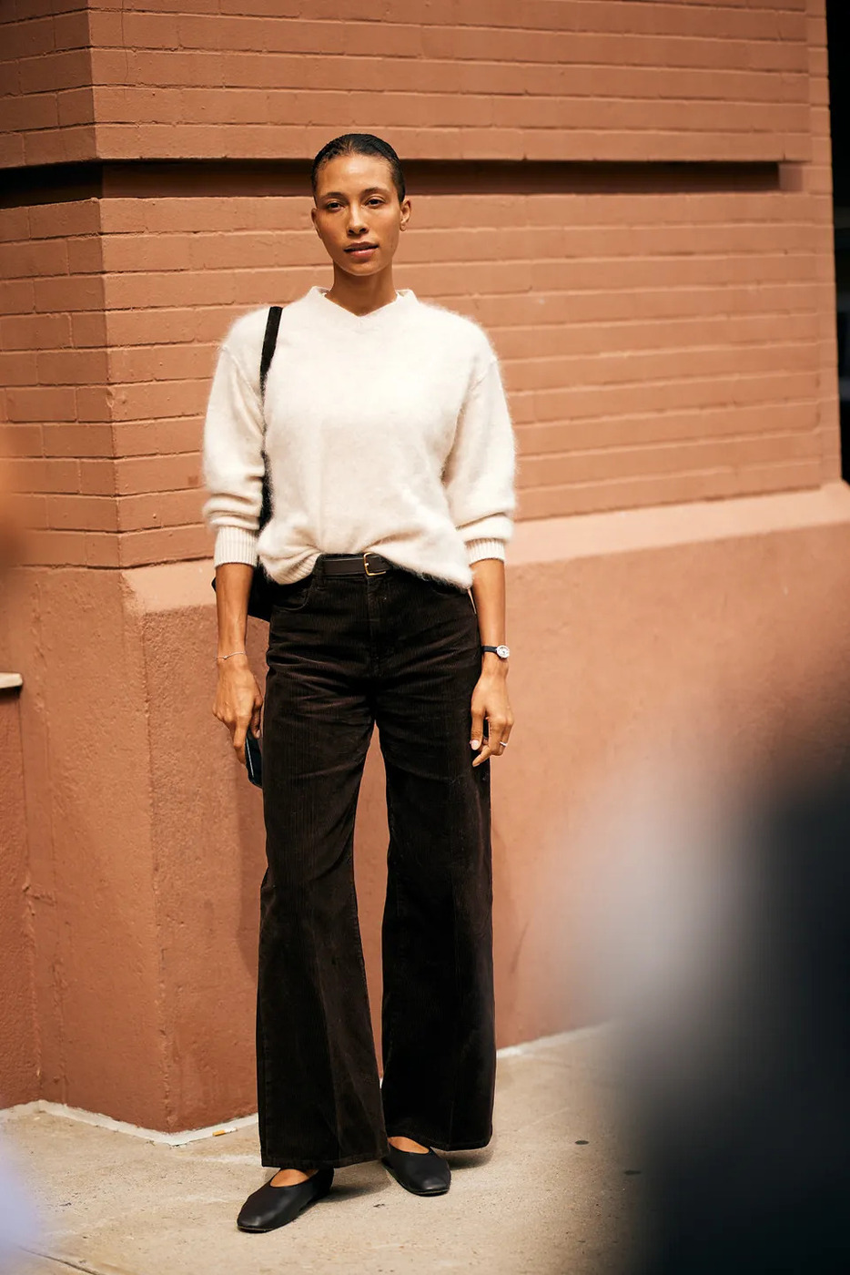 브이넥 + 플레어 팬츠 + 발레 플랫