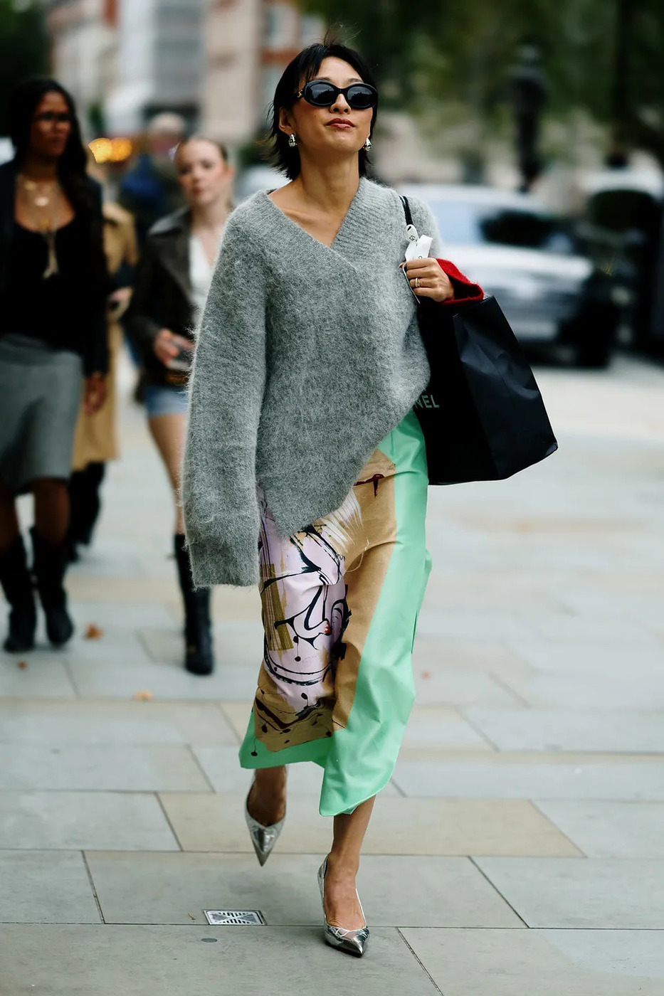 스웨터는 느슨하고 박시할수록 오히려 더 단정해질 수 있습니다. 여기에 미디 길이 프린트 스커트 하나만 있으면 브이넥이 주는 진지한 기운을 싹 빼주고요.