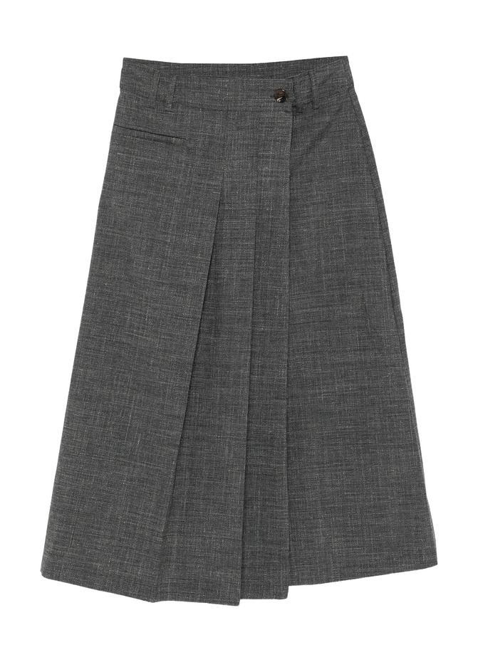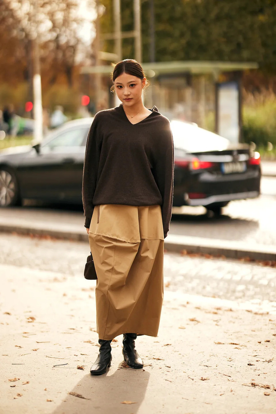 가을 무드를 끌어올리는 브라운과 함께 베이지나 그레이 컬러를 매치하면 은근한 무게감을 표현할 수 있습니다. 스커트 아래로 보이는 부츠는 부드러운 룩에 묵직한 멋을 더해주죠.