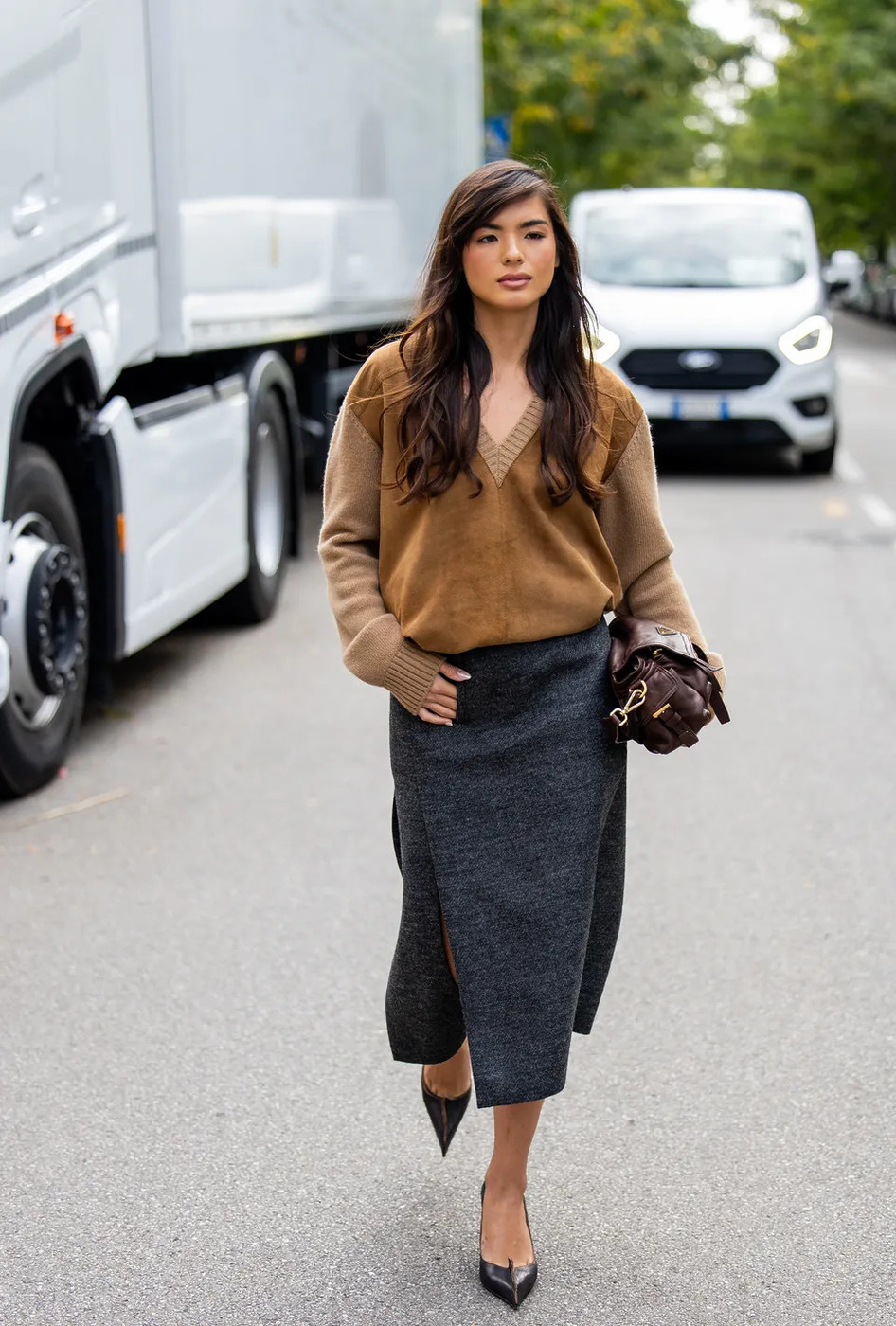 카멜 브이넥 니트 + 미디스커트 + 포인티드 펌프스