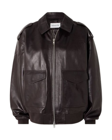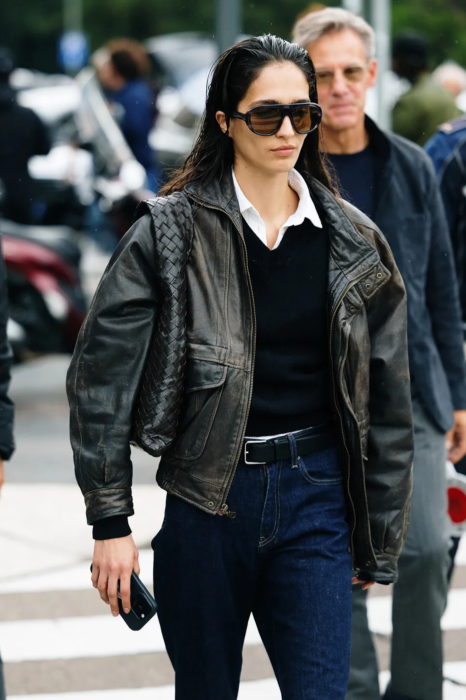 클래식 브이넥 + 버튼다운 셔츠 + 가죽 재킷