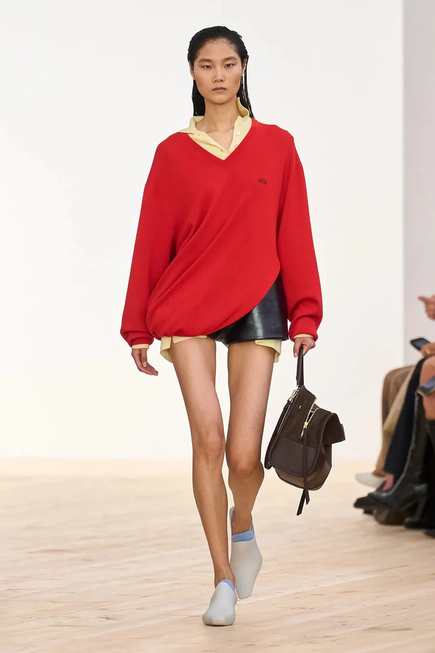 더 로우, 프라다, 보테가 베네타가 모두 브이넥의 가능성을 제시했습니다. 이 트렌드는 최근 공개된 2026년 봄/여름 런웨이에서도 이어지며 더 확신을 주었죠. 잭 맥콜로와 라자로 에르난데스는 첫 로에베 컬렉션에서 일부러 구긴 듯한 칼라의 셔츠 위에 오버사이즈 니트를 겹쳐 연출했고, 디올 여성복 데뷔 무대에서 조나단 앤더슨은 대학생풍 스트라이프가 가미된, 깊이 파인 브이넥 오트밀 컬러 니트를 선보였거든요.