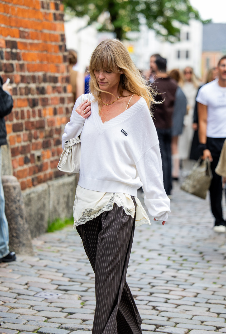 레이어드하기에도 브이넥 스웨터만큼 좋은 게 없습니다. 버튼업 옥스퍼드 셔츠, 폴로 톱 혹은 티셔츠 위에 겹쳐 입으면 한층 프레피한 무드를 완성할 수 있죠. 보테가 베네타와 더 로우 같은 브랜드는 두껍고 묵직한 울 또는 캐시미어 소재의 하이 브이넥 디자인도 내세웠습니다. 목선을 살짝 스치는 높이의 브이넥은 와이드 팬츠나 청바지, 심플하지만 정제된 액세서리 같은 조용한 럭셔리 아이템과 함께할 때 특히 우아하게 보이죠.