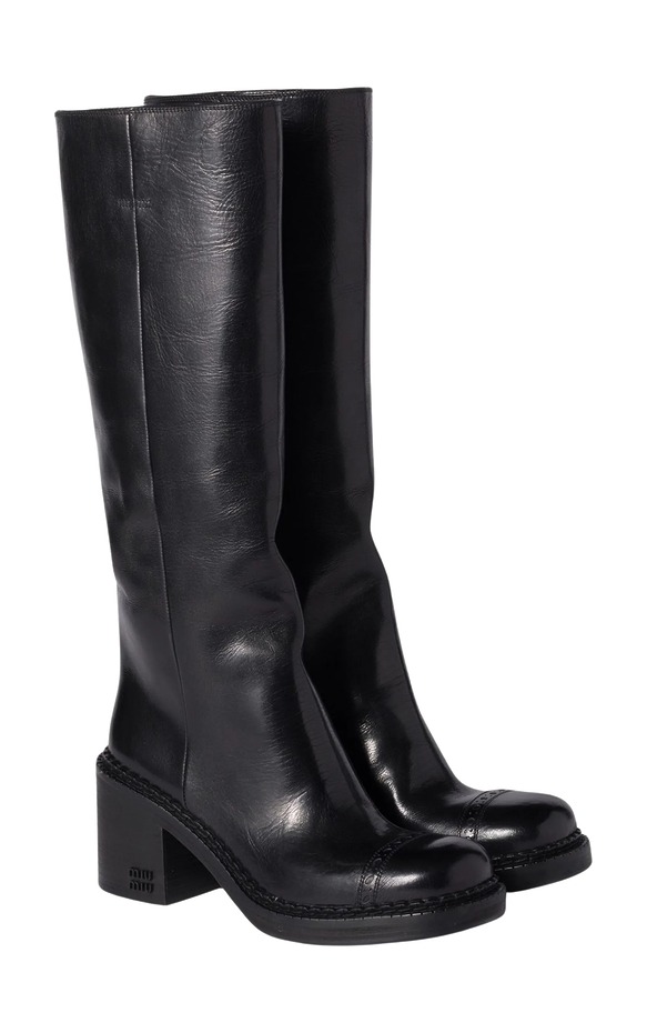 브라운 브이넥 + 미디스커트 + 니하이 부츠
