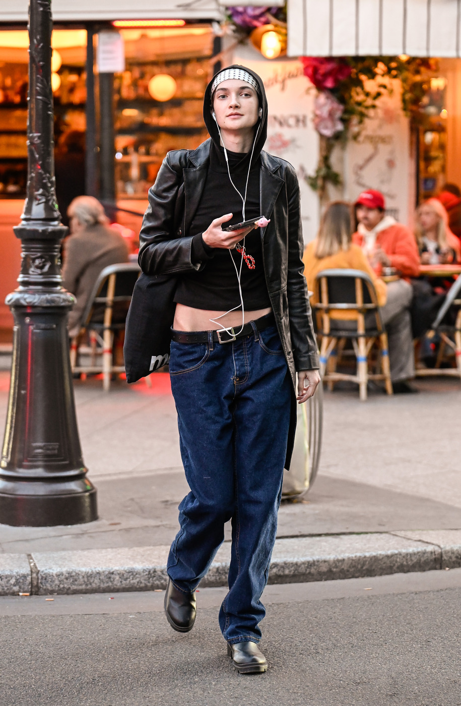 계절이 계절이니만큼 가죽 재킷의 존재감을 끌어올릴 때인데요. 가장 좋은 방법은 핏을 활용한 실루엣 플레이를 즐기는 겁니다. 무게감 있고 널따랗게 떨어지는 아빠 가죽 재킷에 슬림한 하이 웨이스트 청바지를 매치해보세요. 이 룩의 대비가 주는 강렬함은 배기 진에 미련이 없어질 정도죠.
