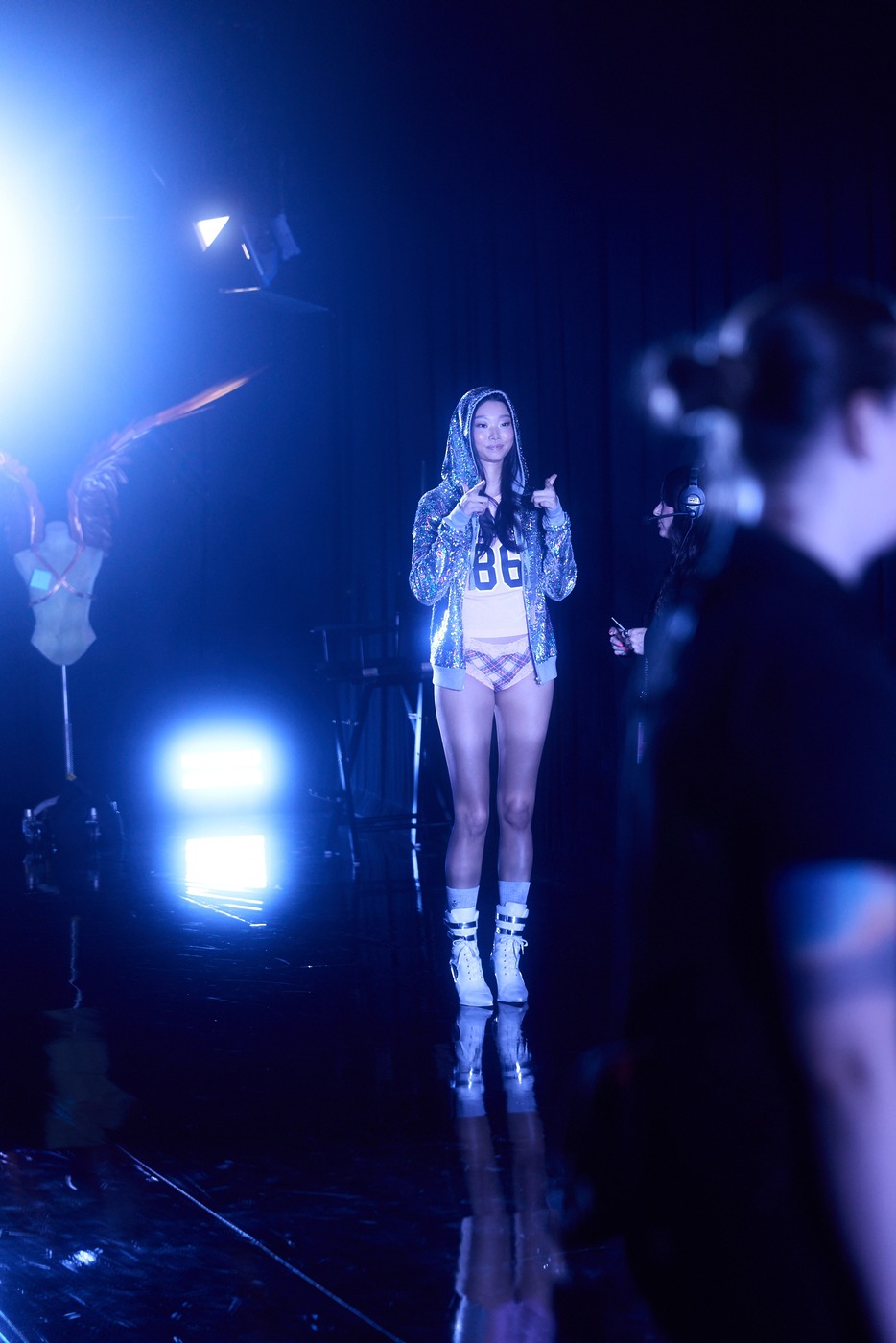 어떤 룩을 배정받을지 알 수 없었기에 출연이 결정된 날부터 몸 컨디션을 최상으로 끌어올리기 시작했다. 거의 매일 운동을 했고, 출국 3일 전부터는 식단에서 탄수화물을 제외했다. “조금만 신경 써도 큰 차이가 보이기 때문에 최근 들어 가장 신경 써서 보디 컨디션을 챙겼어요.” 쇼는 저녁 7시에 시작했지만, 모든 모델의 콜 타임은 아침 8시였다. 라이브 공연과 런웨이가 동시에 진행되는 만큼 리허설과 모션 점검이 길게 이어졌다. “디렉션은 주로 두 가지였어요. ‘Be Yourself’ 그리고 웃기!”
