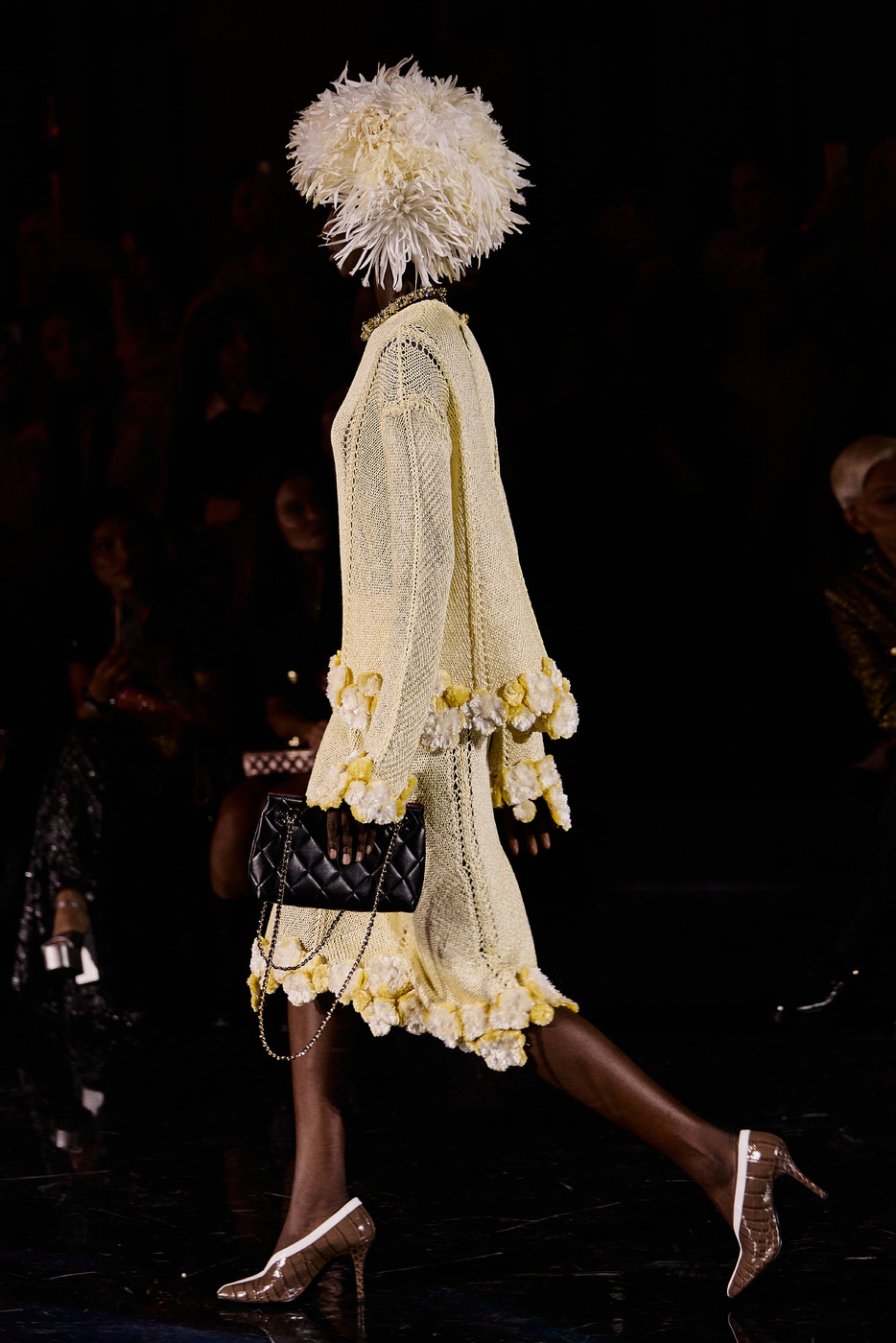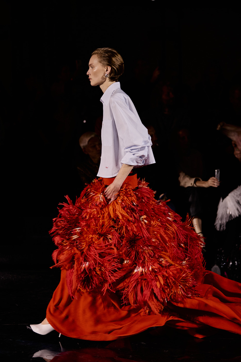 그의 새로운 브랜드 앰배서더 니콜 키드먼과 아요 어데버리가 프런트 로에서 쇼를 관람하고 있는데도 레드 카펫 드레스 같은 전통적인 룩은 등장하지 않았다. 그 대신 그는 새틴 티셔츠에 풍성한 깃털 장식 스커트를 매치한 룩을 내보냈다. 살짝 들린 스커트 아래 업그레이드된 캡토 슈즈가 엿보였다. “샤넬 코드의 좋은 점은 덜어내도 여전히 샤넬처럼 보인다는 겁니다.” 블라지가 첫 쇼에 담은 메시지는 ‘이제 시작에 불과하다’는 것이었다. VK