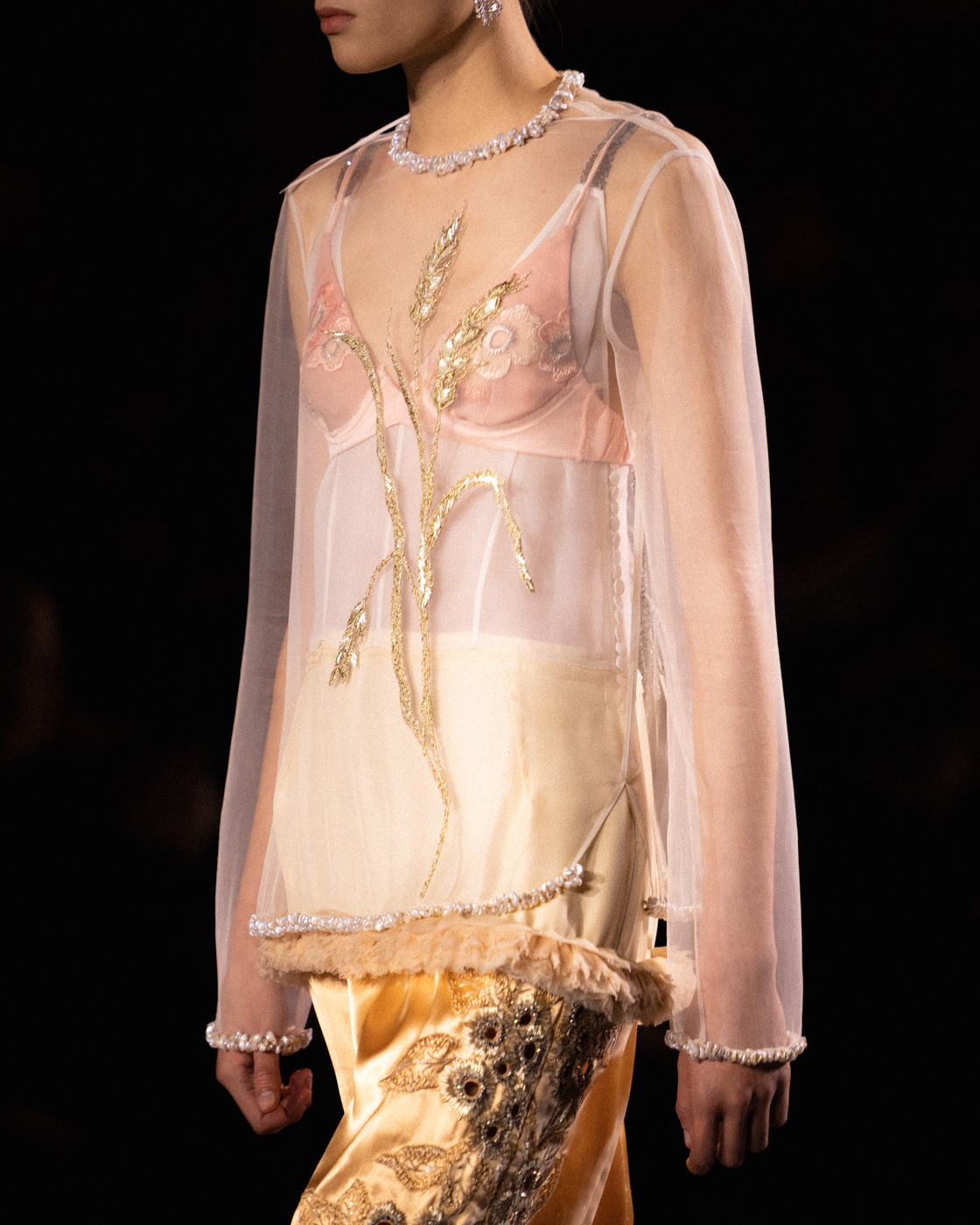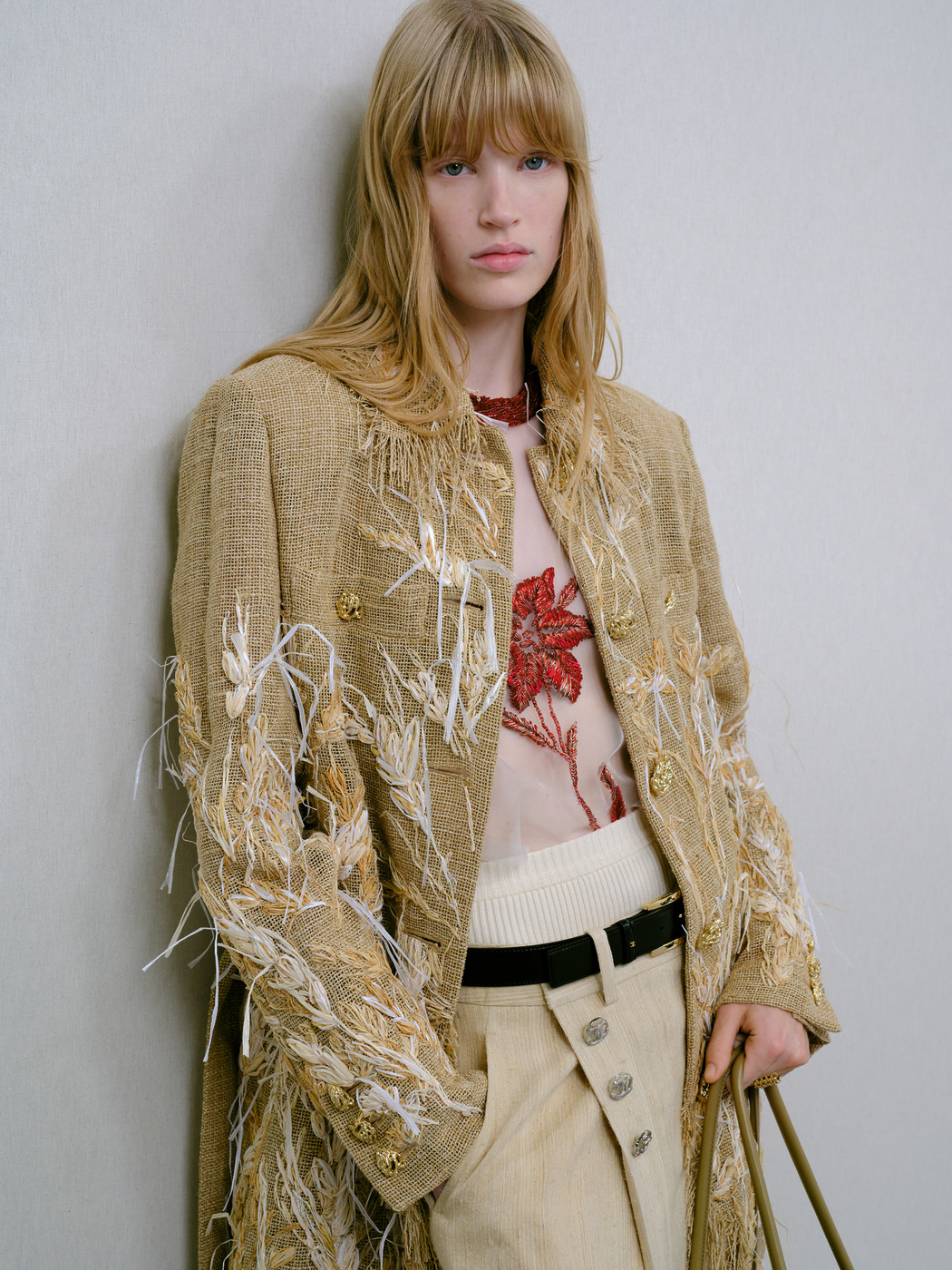 패션계에서 코코 샤넬 하우스의 상징을 모르는 이는 거의 없다. 리틀 블랙 드레스, 트위드 수트, 움직임이 자유로운 니트 저지, 까멜리아, 더블 C. 그럼에도 블라지는 출근 첫날, 하우스의 아카이브로 향했다. “완전히 압도됐습니다. 너무 아름다웠고, 어디서부터 시작해야 할지 몰랐어요.” 그의 설명에 따르면, 그는 본능적으로 샤넬이 연인 아서 에드워드 ‘보이’ 카펠의 옷장과 전통적인 남성복의 기능성을 응용한 파격적인 방식을 가장 먼저 염두에 두고 있었다. 오프닝 룩인 크롭트 재킷 팬츠 수트는 허리 아랫부분을 잘라내고 단추 위치를 조정한 블라지 자신의 재킷에 기반한 것이었고, 후에 나온 박시한 실루엣의 셔츠는 방돔 광장의 유명한 셔츠메이커 샤르베(Charvet)와 협업해 완성한 것이었다. 그는 하우스의 재킷과 마찬가지로 셔츠 끝단 안쪽에도 샤넬의 시그니처인 금속 체인을 달아 실루엣이 깔끔하게 떨어지는 동일한 효과를 시도했다.