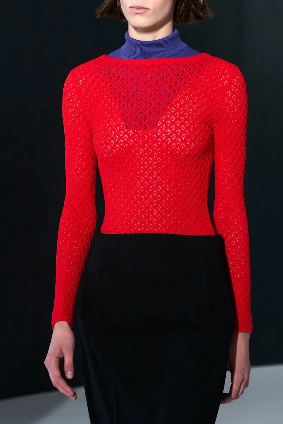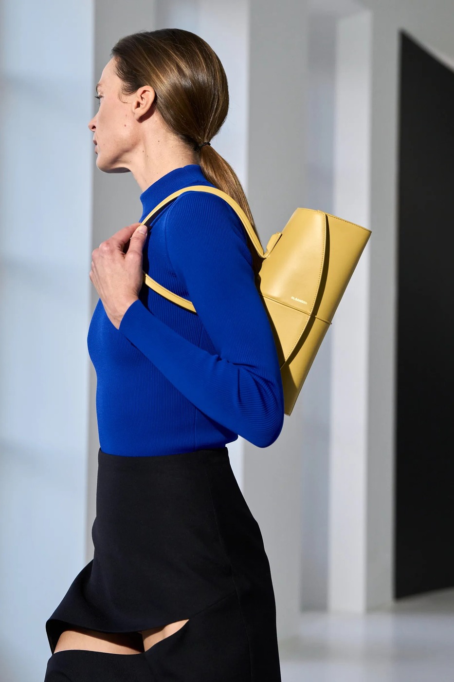 벨로티는 기초를 다지면서 아이코닉한 질 샌더의 더블 페이스 코트를 극도로 얇은 가죽으로 재현했다(장인 정신을 제대로 느끼기 위해서는 아주 가까이에서 볼 필요가 있다). 그리고 테일러링에는 세련된 위트를 더했다. 바지의 골반 부분을 좁고 길게 잘라내거나 재킷 뒷면을 깊이 파서 피부를 드러내는 식이었다. 그런가 하면 구조적이면서도 결코 무겁지 않게 풀어낸 피스도 있었다. 올이 풀린 실크를 층층이 쌓아 장식한 시프트 드레스, 대비되는 컬러로 여러 겹 레이어드한 아주 얇고 섬세한 니트 드레스 등이 런웨이에 등장했다.