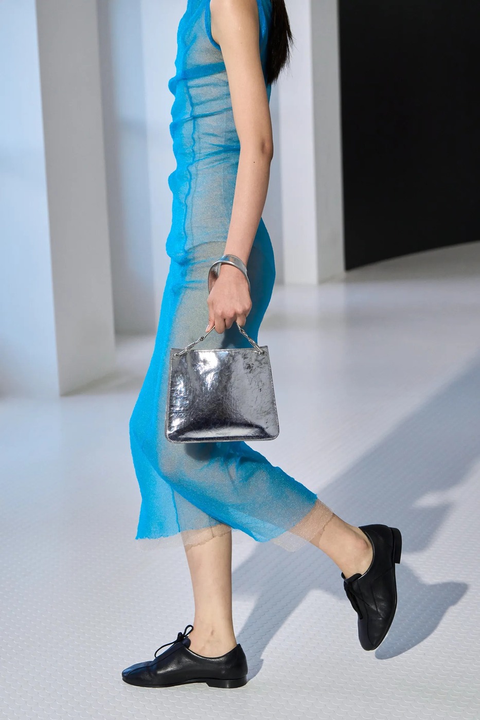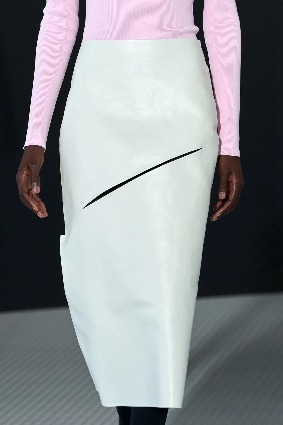 리처드 프린스(Richard Prince)의 ‘후즈(Hoods)’ 시리즈에서 영감을 얻었다는 반 시누스의 흰색 A 라인 스커트는 다트의 접힌 부분이 밖을 향하도록 재단해 미묘한 기하학적 볼륨을 만들어냈다. 벨로티는 이 디테일을 ‘현대적인 갑옷(Modern Armature)’이라 표현했다. 또 다른 스커트는 사선으로 잘려나가기도 했는데, 루치오 폰타나의 팬이라면 알아볼 만한 모티브였다. 어떤 드레스는 복부가 둥근 창처럼 뚫려 있어, 안쪽으로 갑옷의 쇠사슬처럼 비즈를 장식한 브라가 은근히 드러났다. ‘신체를 드러낸다’는 것은 꼭 ‘속살을 노출한다’는 의미가 아니다. 사실 이런 직접적인 방식은 오리지널 질 샌더의 감성과는 거리감이 있다. 그래서 벨로티는 서로 다른 농도와 형태의 니트를 다양하게 활용해 새로운 균형을 시도했다. 예를 들어 어린아이 옷처럼 작게 줄어든 스웨터를 슬림한 스키 니트 위에 겹쳐 입고, 여기에 청바지를 매치했다. 이 역시 과거 질 샌더가 런웨이에 데님을 선보인 것과는 다른 방향이었지만 그녀가 무대를 떠난 지 12년이 흘렀고, 그 사이 스타일은 달라졌다. 그리고 벨로티는 이미 현실감 있는 디자인으로 큰 성공을 거둔 적이 있으니 말이다. 그런 실용적인 측면에서 이번 컬렉션의 슈즈도 주목할 만하다. 앞코에 ‘아마추어(Armature)’ 디테일, 그러니까 각을 연출한 반짝이는 옥스퍼드 슈즈, 비대칭 라인의 발레 플랫, 곡선형 굽이 돋보이는 펌프스 등은 모두 독창적이면서도 일상적이었다. 벨로티의 첫 번째 질 샌더 쇼를 요약하면 구조와 유연함, 전통과 현대, 노출과 절제의 공존을 세련되게 조율한 한 편의 선언문이자 ‘균형의 미학’이라 표현할 수 있다. VK