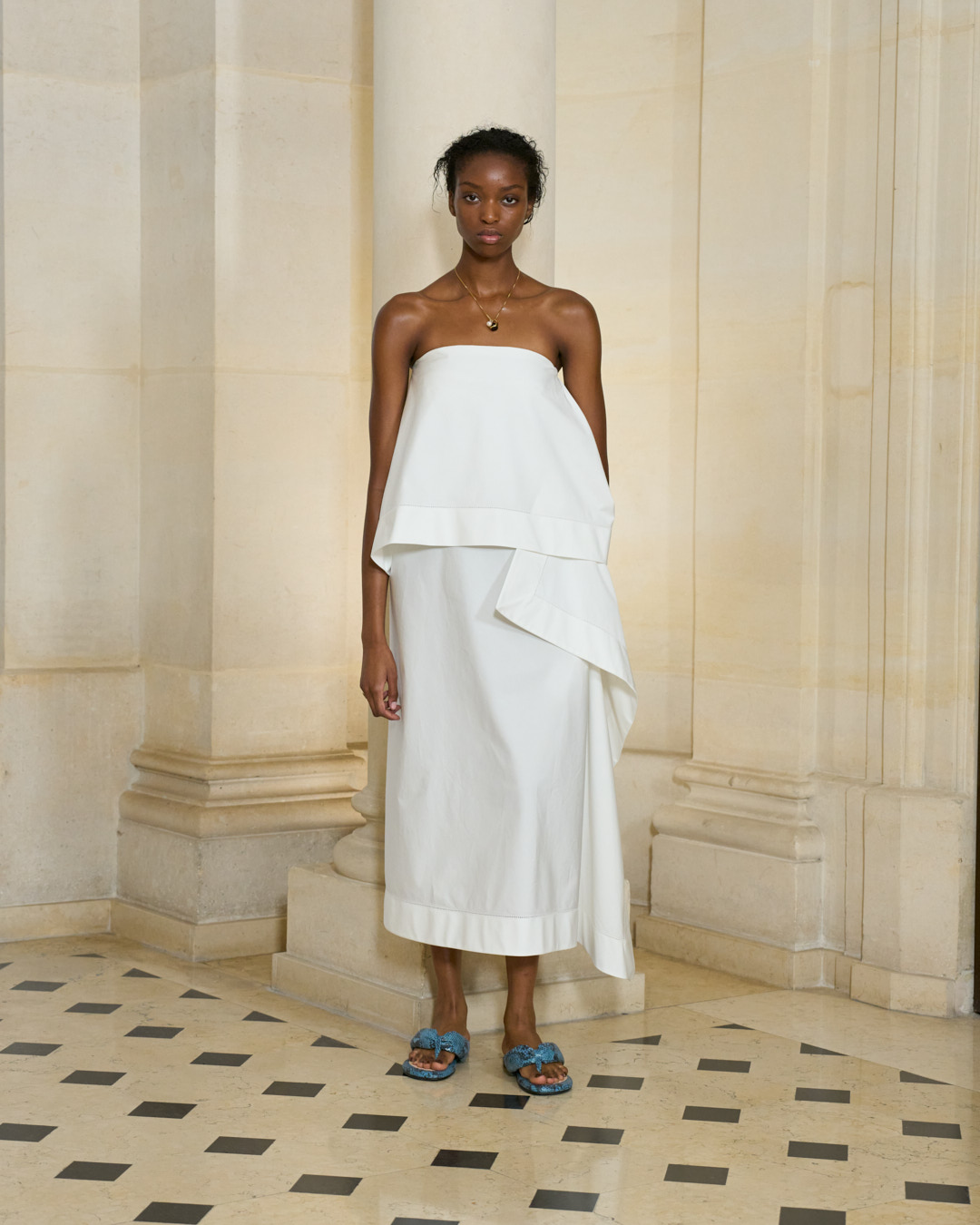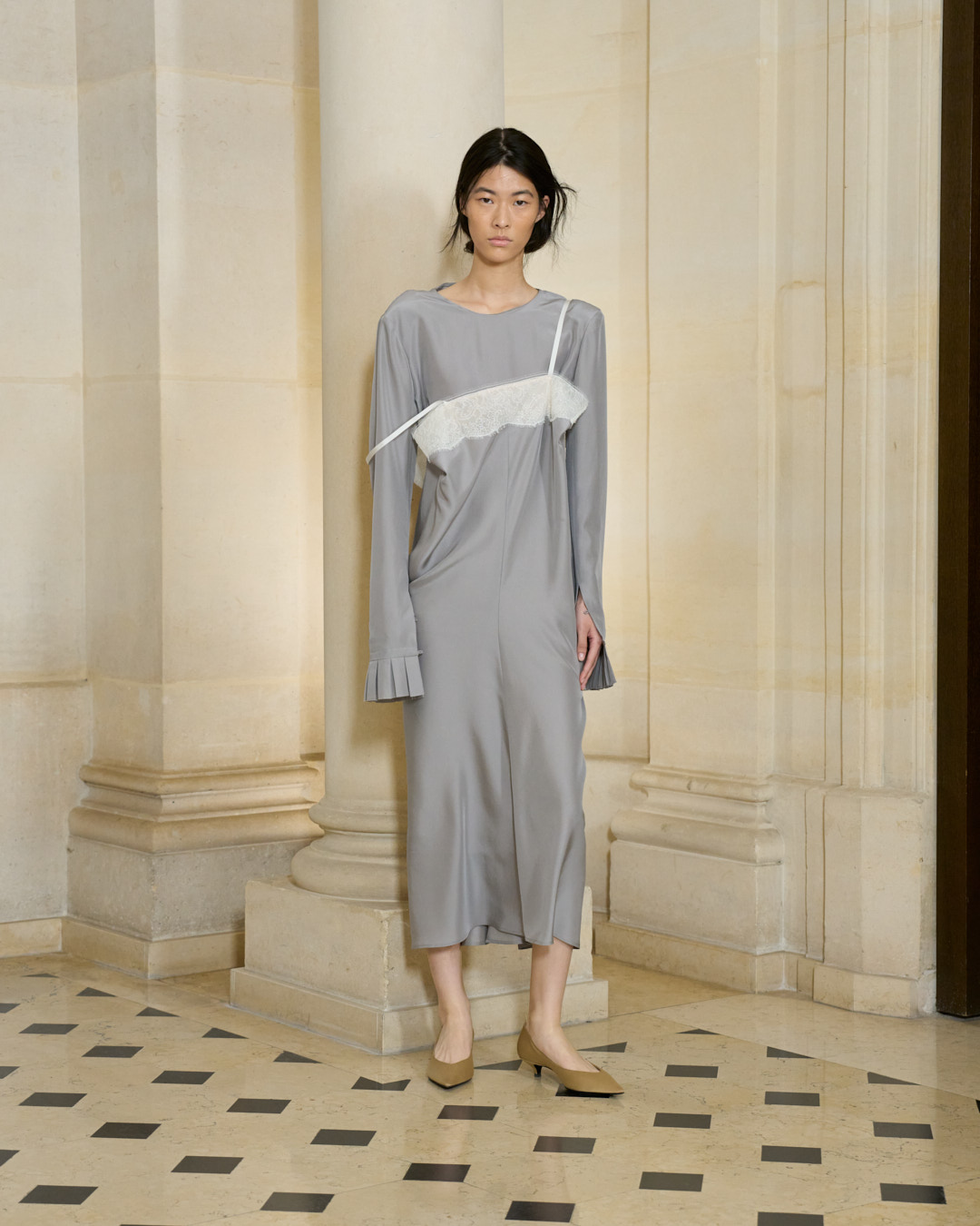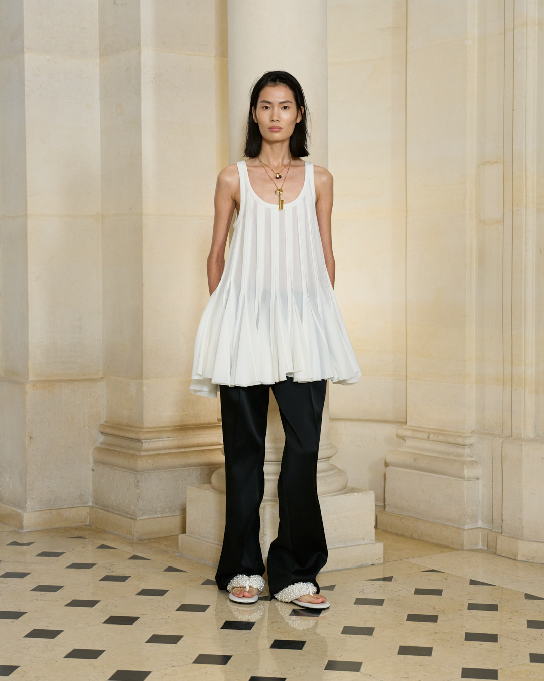 마크 토마스는 프랑스의 침구와 식탁보에서 영감받은 디자인과 레이스 장식이 달린 슬립 드레스를 선보이며 ‘집’이라는 개념을 의상에 접목했다. 포근한 이불이나 목욕 가운을 닮은 룩을 런웨이에 자주 올리던 루이스 트로터의 유산을 이어간 것이다. 실크에 적용한 은은한 프린트, 반복적으로 등장한 물결무늬는 하우스 창립자 마담 까르벵이 식물학자 마르셀 르쿠플(Marcel Lecoufle)과 함께 개발한 흰 난초에서 모티브를 얻어 탄생했다. 1945년 파리에서 탄생해 쭉 패션 수도를 지키고 있는 하우스답게 파리지앵 스타일을 참고한 흔적도 눈에 띄었다. 신체를 은근히 드러내는 테일러링은 더없이 파리다웠고, 단추를 풀어 헤친 셔츠 사이로 보이는 브래지어나 하늘하늘한 바지는 누군가가 지나갈 때 남는 향과 자취를 의미하는 프랑스어 ‘실라주(Sillage)’를 떠올리게 했다. 무엇보다 강렬한 인상을 남기는 것이 중요한 데뷔 쇼에서 마크 토마스는 자신의 강점인 ‘수용성’과 ‘현실성’을 유감없이 드러냈다. VK