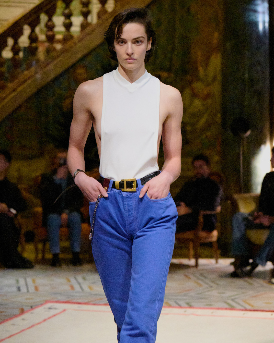 비탈레의 베르사체는 여전히 섹시했지만, 과거의 베르사체와는 다른 의미의 섹시함이었다. 좀 더 흐트러져 있었다. 앞에서 보면 프랑스 디자이너 마담 그레(Madame Grès)가 연상되는 우아하고 구조적인 저지 드레스는 뒷면이 브리프 위에 간신히 걸쳐 있을 정도로 아슬아슬했다. 마이애미 해변의 머슬 티셔츠처럼 옆면이 깊이 파인 슬리브리스 톱의 끝단을 일부러 올이 풀린 채로 두었고, 하이 웨이스트 진의 벨트도 버클이 채워져 있지 않았다.